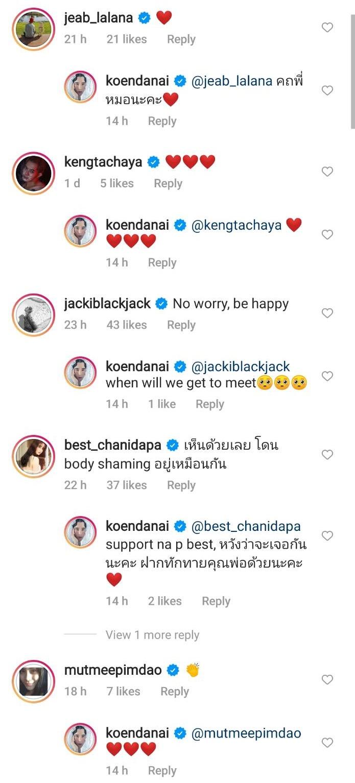 โดยมีแฟนๆ แห่กดไลค์พร้อมทั้งคอมเมนต์ให้กำลังใจแบบรัวๆ บ้างก็บอกเล่าประสบการณ์ที่เจอคำพูด Body Shaming มากับตัว ด้านคนในวงการบันเทิงต่างให้กำลังใจ อาทิ เจี๊ยบ ลลนา, แจ๊ค จารุพงษ์, เก่ง ธชย, เบสท์ ชนิดาภา, มัดหมี่ พิมพ์ดาว ฯลฯ
