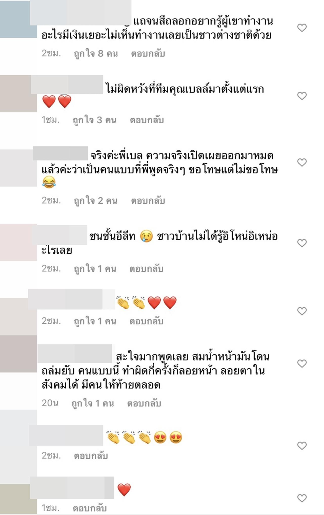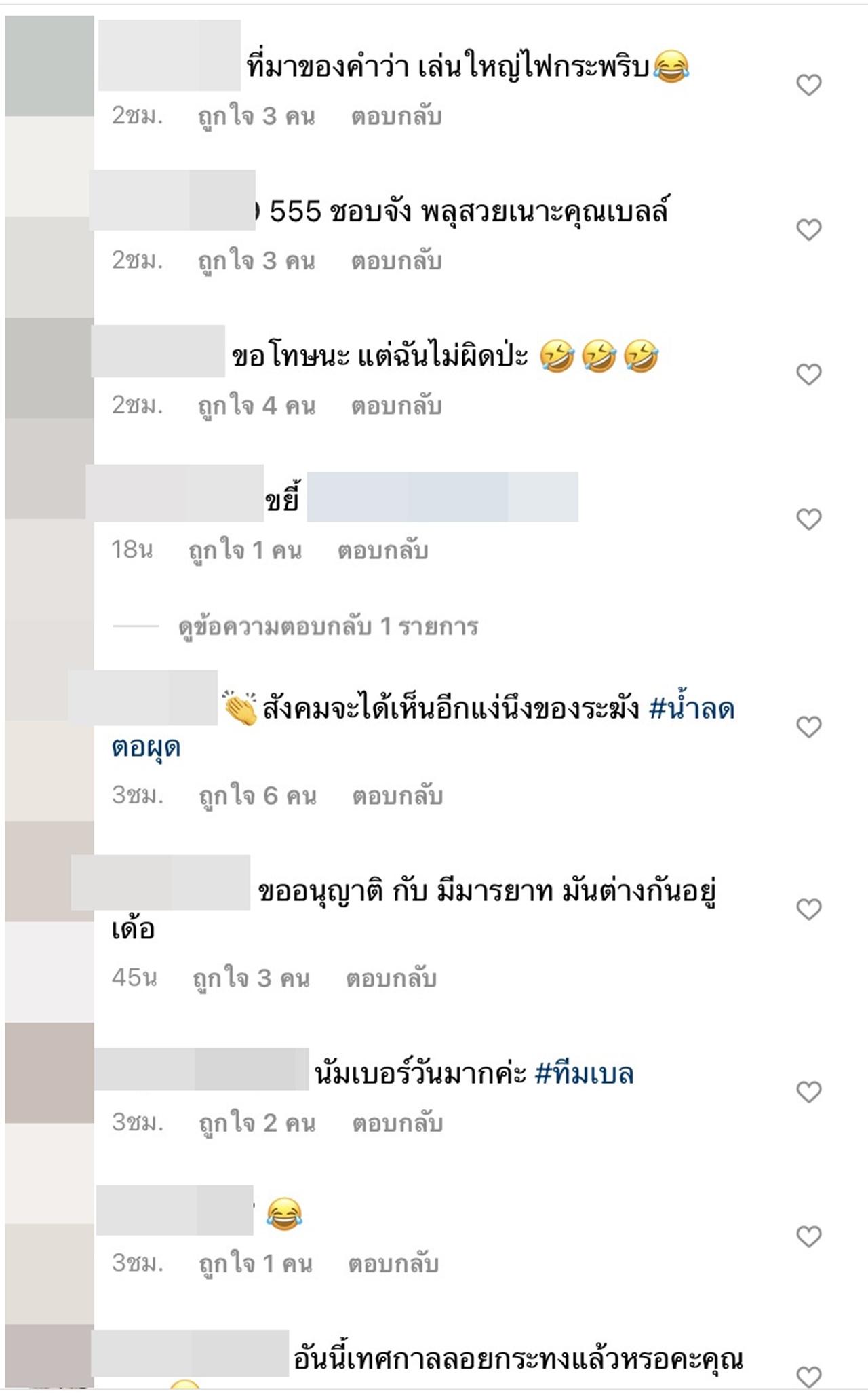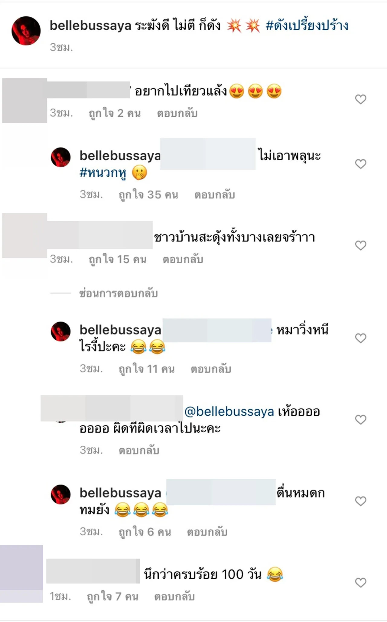 ซึ่งงานนี้ชาวเน็ตแต่ละคนเข้ามาคอมเมนต์สุดแซ่บแบบรัวๆ ในอินสตาแกรมของ เบล บุษยา ว่า "ชาวบ้านสะดุ้งทั้งบางเลยจ้า, ที่มาของคำว่า เล่นใหญ่ไฟกระพริบ, ขออนุญาติกับมีมารยาท มันต่างกันอยู่, แถจนสีถลอก อยากรู้ว่าผู้เขาทำงานอะไร มีเงินเยอะ ไม่เห็นทำงานเลยเป็นชาวต่างชาติด้วย, ไม่ผิดหวังที่ทีมคุณเบลมาตั้งแต่แรก".