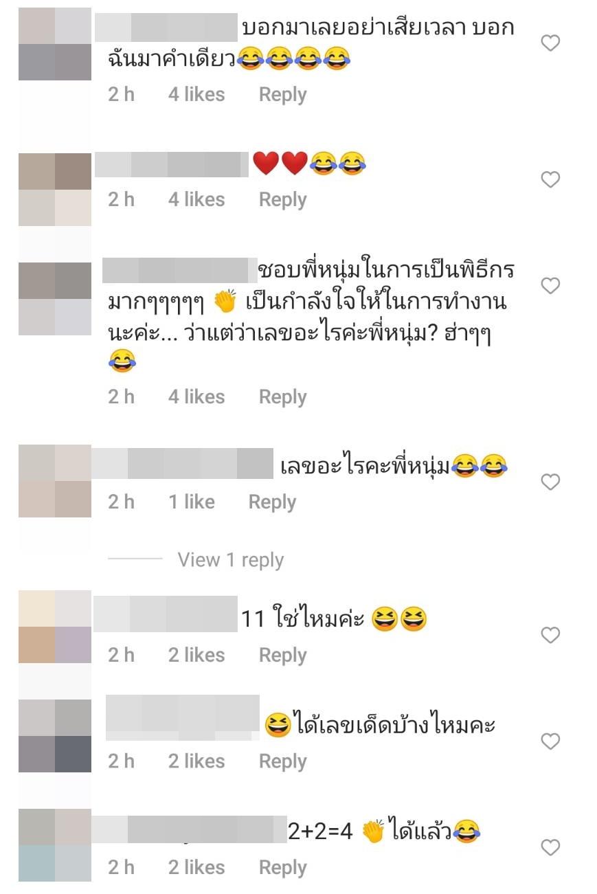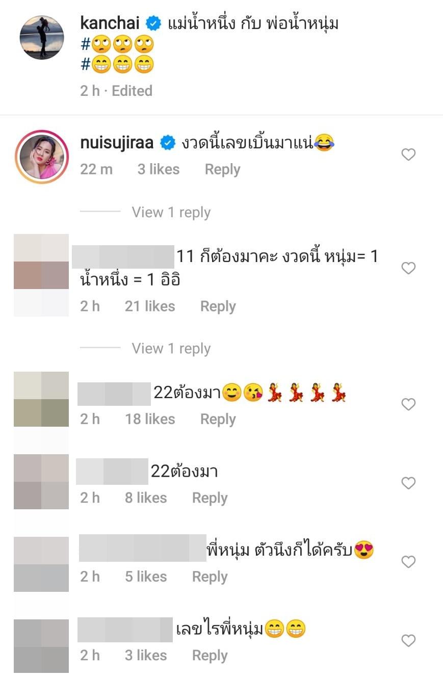 รวมถึงภาพคู่กับแม่น้ำหนึ่งตอนที่ถ่ายรายการด้วยกัน พร้อมทั้งเขียนแคปชั่นขำๆ “แม่น้ำหนึ่ง กับ พ่อน้ำหนุ่ม” และใส่อีโมจิมองบนและยิ้มกว้าง ทำเอาแฟนๆ แห่คอมเมนต์ถามและตีเลขกันเต็มไอจี อาทิ พี่หนุ่ม ตัวนึงก็ได้ครับ, เลขไรพี่หนุ่ม, บอกมาเลยอย่าเสียเวลา บอกฉันมาคำเดียว, 11 ก็ต้องมาคะ งวดนี้ หนุ่ม= 1 น้ำหนึ่ง = 1 อิอิ, 22 ต้องมา ฯลฯ