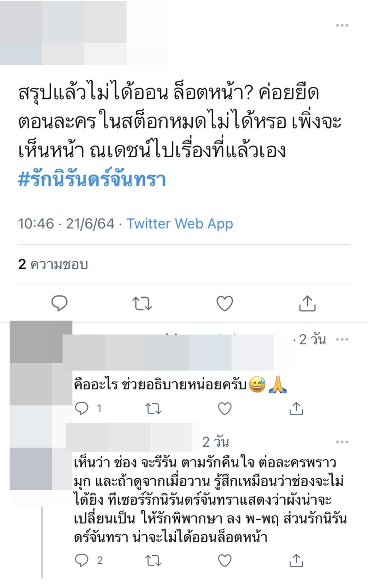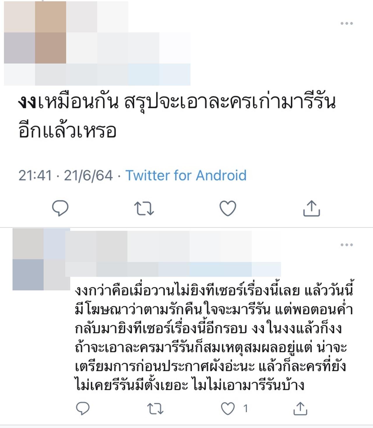 แต่งานนี้ก็มีชาวเน็ตคนอื่นๆ เข้ามาแสดงความคิดเห็นถึงเรื่องการนำละครเก่ามารีรันอีกครั้งของช่อง 3 ว่าอาจจะเป็นเพราะผลกระทบจากโควิด-19 จึงทำให้หลายช่องเอาละครเก่ามารีรันปนกับละครใหม่เพื่อเซฟค่าโฆษณา