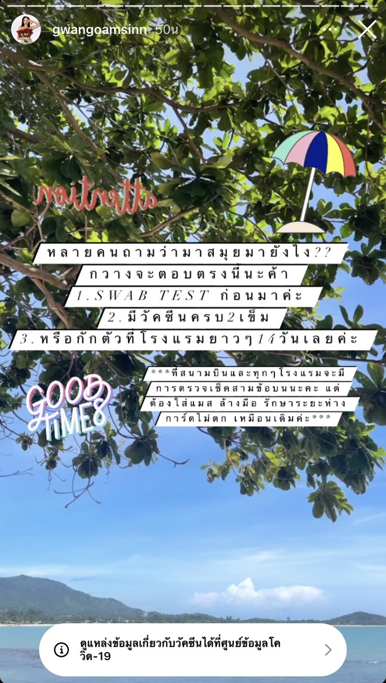 งานนี้นักแสดงสาวคงจะถูกถามมาเยอะมากถึงเรื่องการเดินทางไปที่เกาะสมุย เจ้าตัวเลยถือโอกาสมาตอบข้อสงสัยที่ถูกถามมาเยอะผ่านทางไอจีสตอรี่ของตัวเองว่า