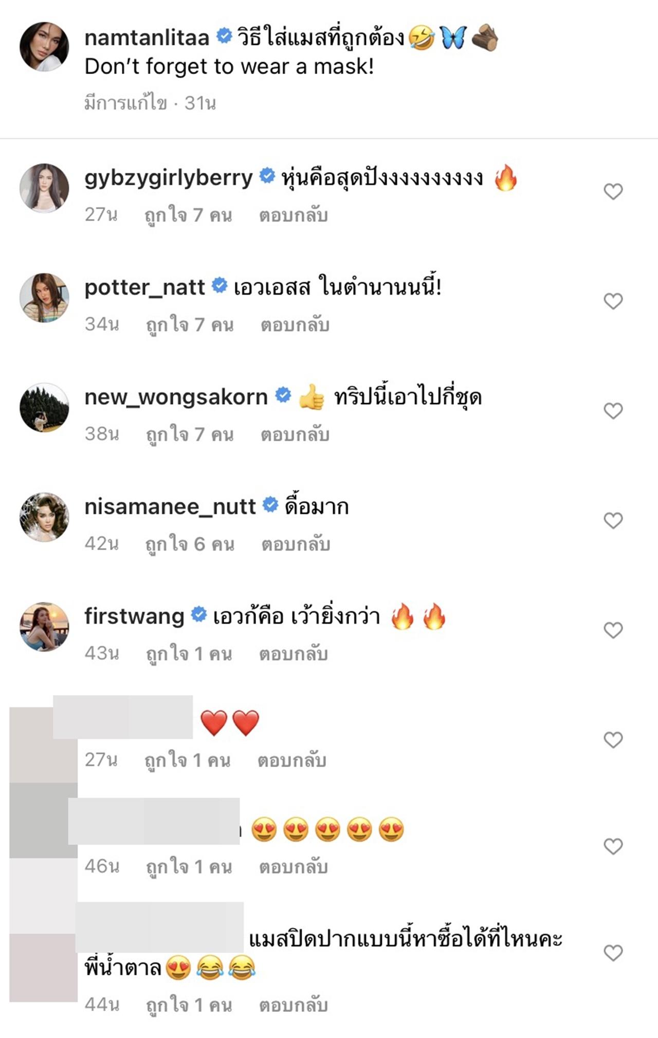 ซึ่งหลังจากที่น้ำตาลโพสต์รูปดังกล่าวไป ก็มีแฟนๆ เข้ามาคอมเมนต์แซวบอกว่าเราใส่แมสก์ผิดกันมาตลอด หรือบางคนก็เป็นห่วงว่าสาวน้ำตาลนั้นดูผอมมากเกินไปและเตือนให้ทานข้าวให้เยอะกว่านี้.