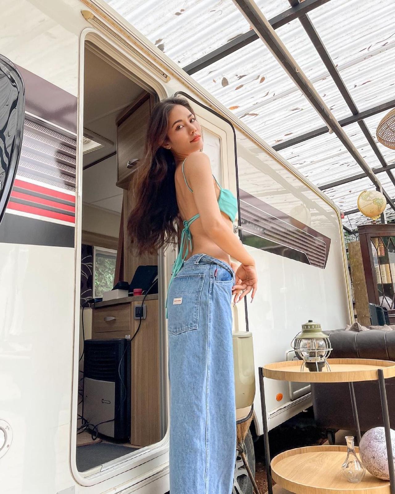 ซึ่งถ้ามองแค่รูปไม่ได้อ่านแคปชั่น ก็จะเห็นสาวน้ำตาลใส่เสื้อสายเดี่ยวตัวจิ๋วสีฟ้าน้ำทะเล กับกางเองยีนส์พับเอวโชว์เอวเอสสวยได้รูป พร้อมกับโพสท่าเก๋ๆ ซึ่งดูแล้วเซ็กซี่น่ารักสุดๆ