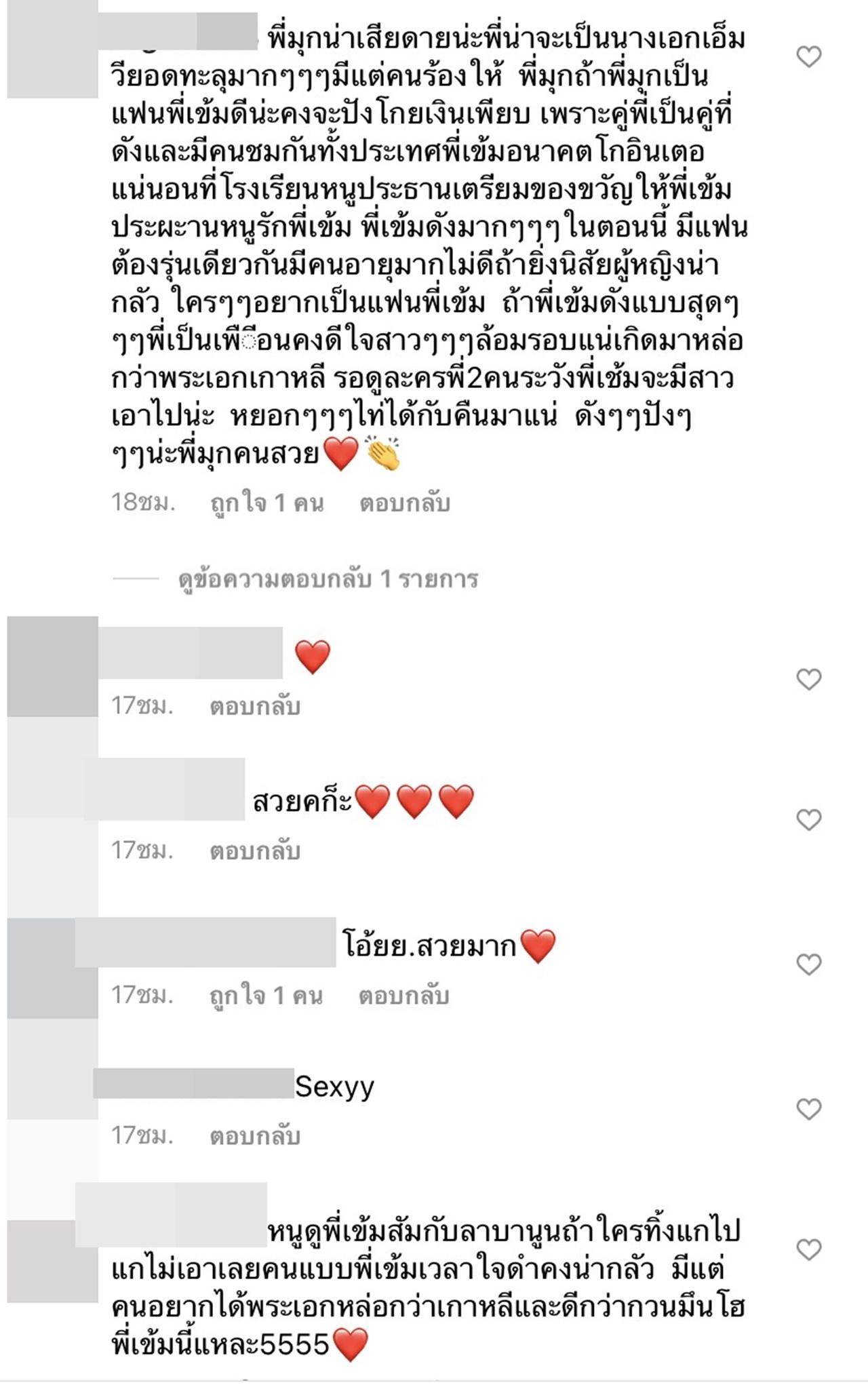และล่าสุดแฟนละครก็ยังได้เข้ามาคอมเมนต์ในอินสตาแกรมของมุกดาเพื่อเกลี้ยกล่อมให้นางเอกสาวคบกับพระเอกหนุ่ม เข้ม หัสวีร์ อีกด้วย ซึ่งมีข้อความว่า