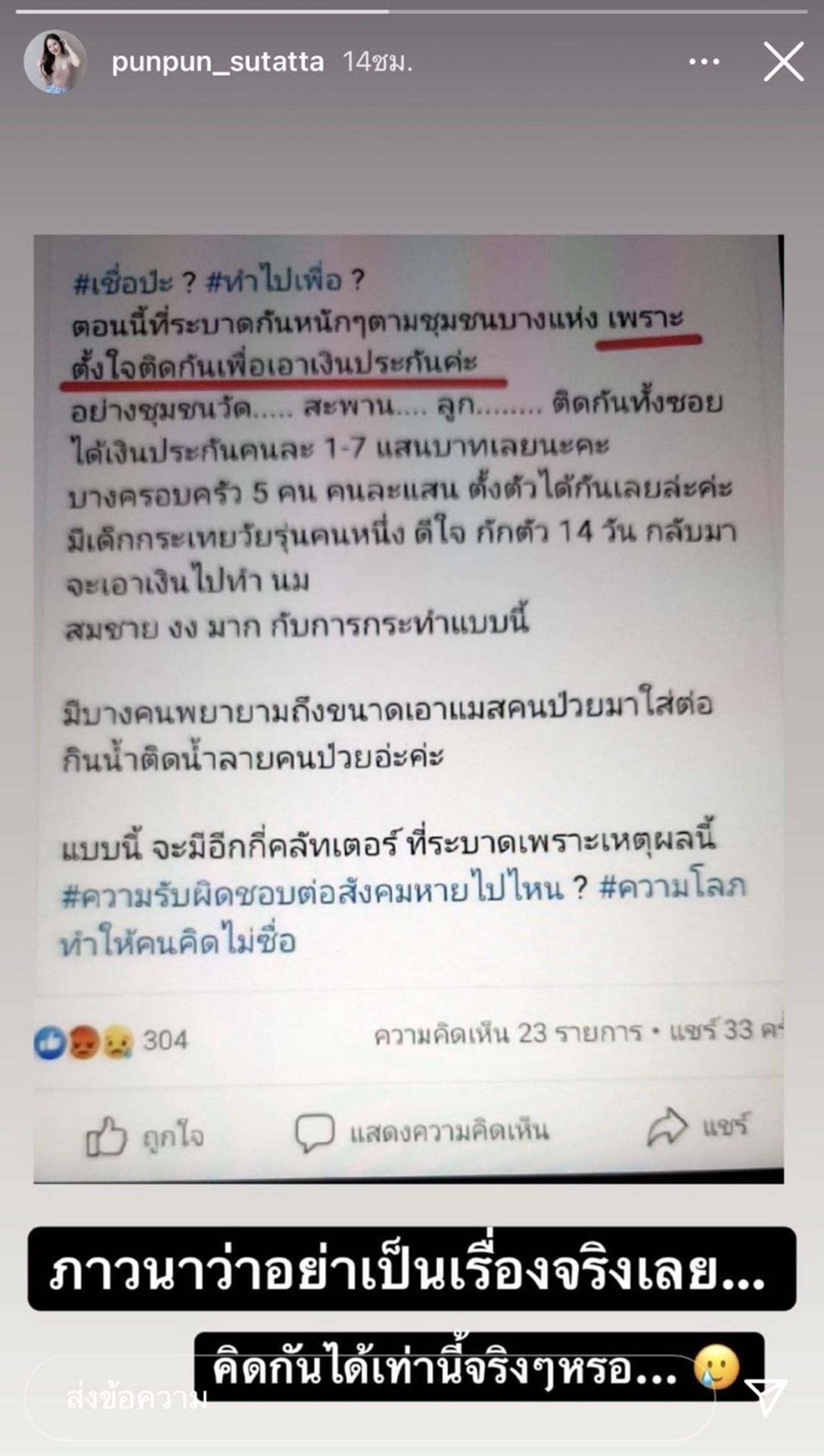 โดย ปันปัน สุทัตตา ได้โพสต์ข้อความดังกล่าวและขีดเส้นแดงว่า "เพราะตั้งใจติดกันเพื่อเอาเงินประกันค่ะ" ซึ่งนักแสดงสาวก็ได้เขียนแคปชั่นเอาไว้ว่า "ภาวนาว่าอย่าเป็นเรื่องจริงเลย... คิดกันได้เท่านี้จริงๆ เหรอ..."