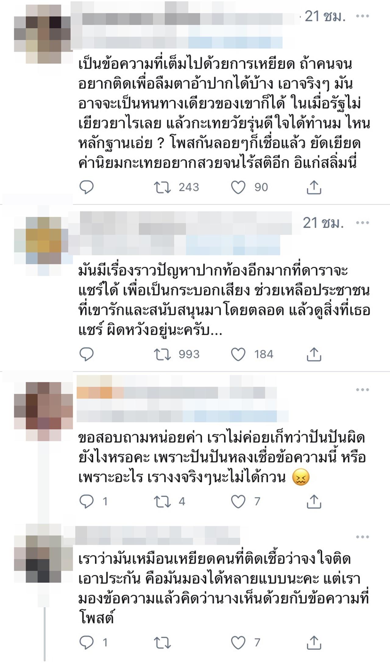 หลังจากที่ ปันปัน สุทัตตา โพสต์ข้อความดังกล่าวไป ก็มีชาวเน็ตนำข้อความของนักแสดงสาวไปโพสต์ลงในทวิตเตอร์ จนทำให้มีชาวทวิตเตอร์เข้ามาแสดงความคิดเห็นกันมากมายและแบ่งออกมาเป็น 2 ฝ่าย