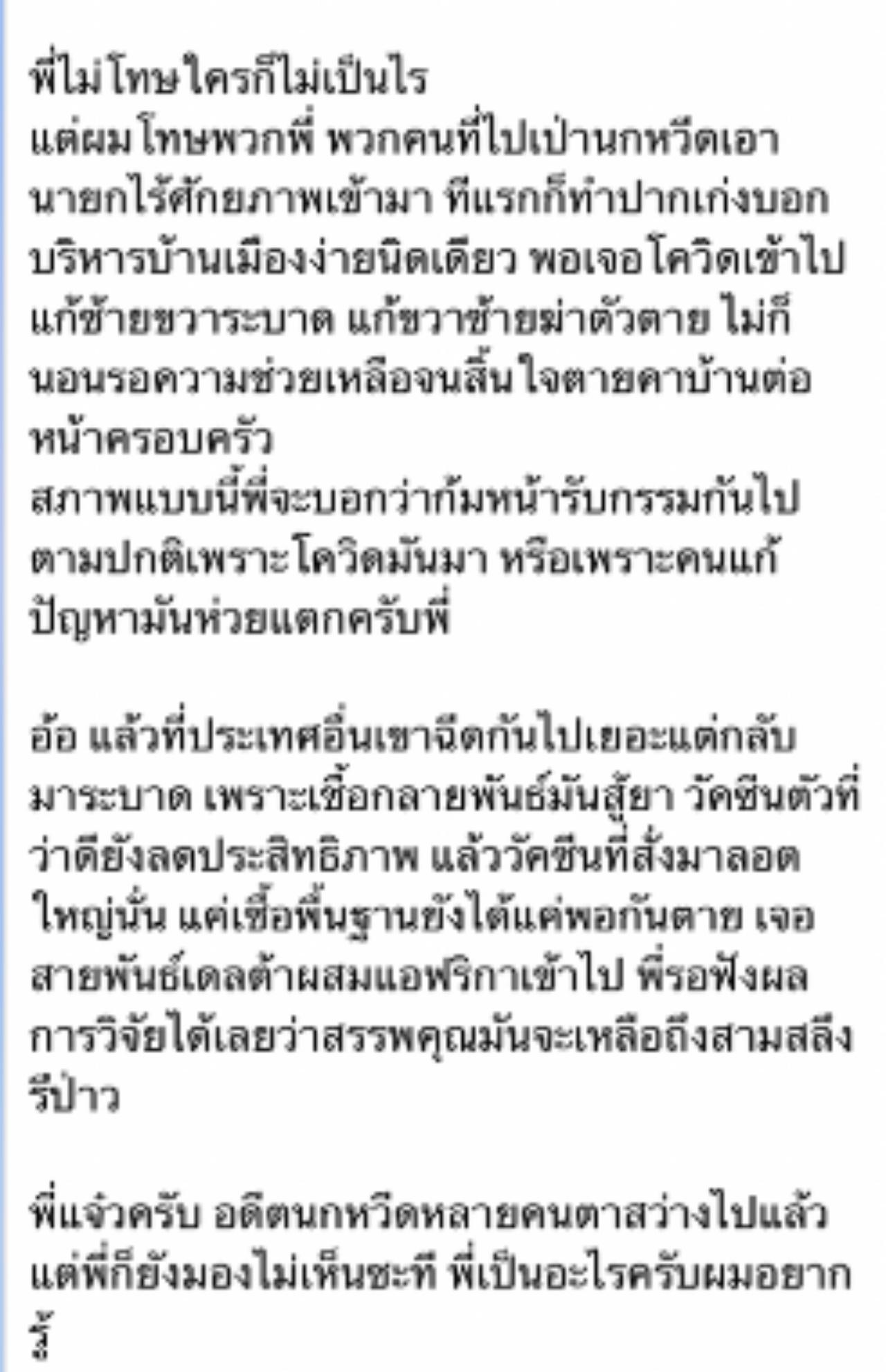 พี่ไม่โทษใครก็ไม่เป็นไร แต่ผมโทษพวกพี่ พวกคนที่ไปเป่านกหวีดเอานายกไร้ศักยภาพเข้ามา ทีแรกก็ทำปากเก่งบอกบริหารบ้านเมืองง่ายนิดเดียว พอเจอโควิดเข้าไป แก้ซ้ายขวาระบาด แก้ขวาซ้ายฆ่าตัวตาย ไม่ก็นอนรอความช่วยเหลือ จนสิ้นใจตายคาบ้านต่อหน้าครอบครัว สภาพแบบนี้พี่จะบอกว่า ก้มหน้ารับกรรมกันไปตามปกติ เพราะโควิดมันมา หรือเพราะคนแก้ปัญหามันห่วยแตกครับพี่