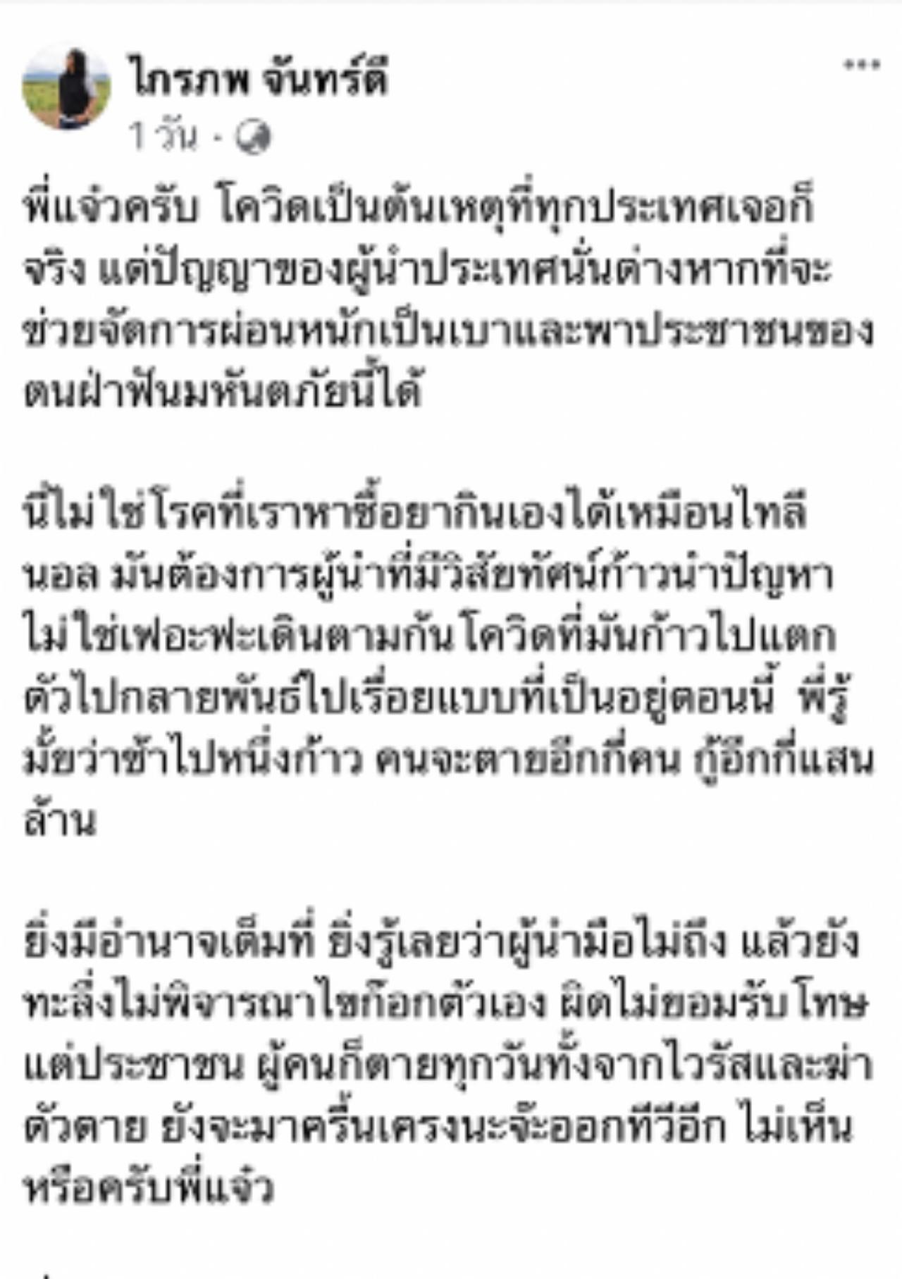 นี่ไม่ใช่โรคที่เราหาซื้อยากินเองได้เหมือนไทลีนอล มันต้องการผู้นำที่มีวิสัยทัศน์ก้าวนำปัญหา ไม่ใช่เฟอะฟะเดินตามก้นโควิด ที่มันก้าวไปแตกตัวไปกลายพันธุ์ไปเรื่อยแบบที่เป็นอยู่ตอนนี้ พี่รู้มั้ยว่าช้าไปหนึ่งก้าว คนจะตายอีกกี่คน กู้อีกกี่แสนล้าน