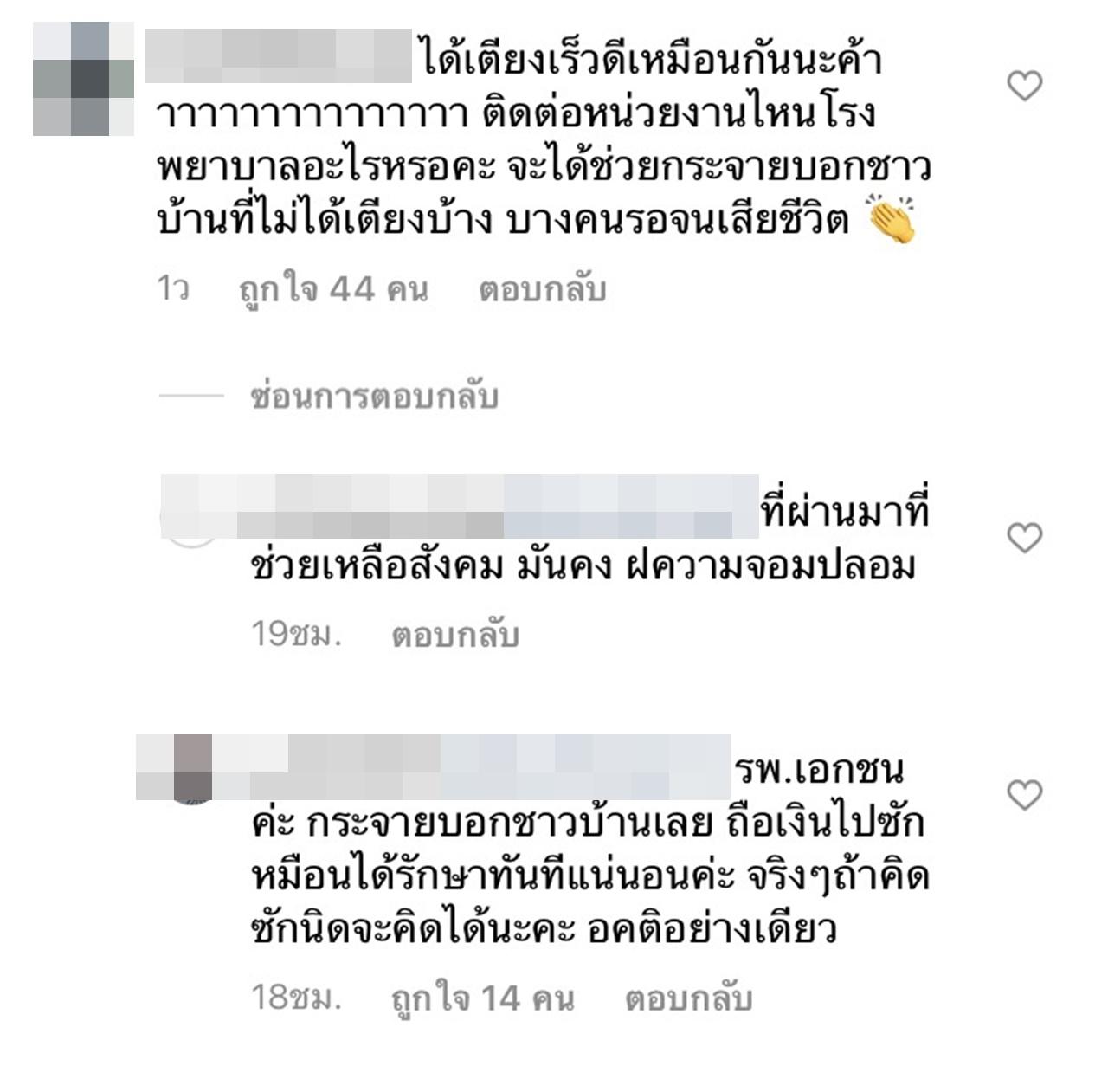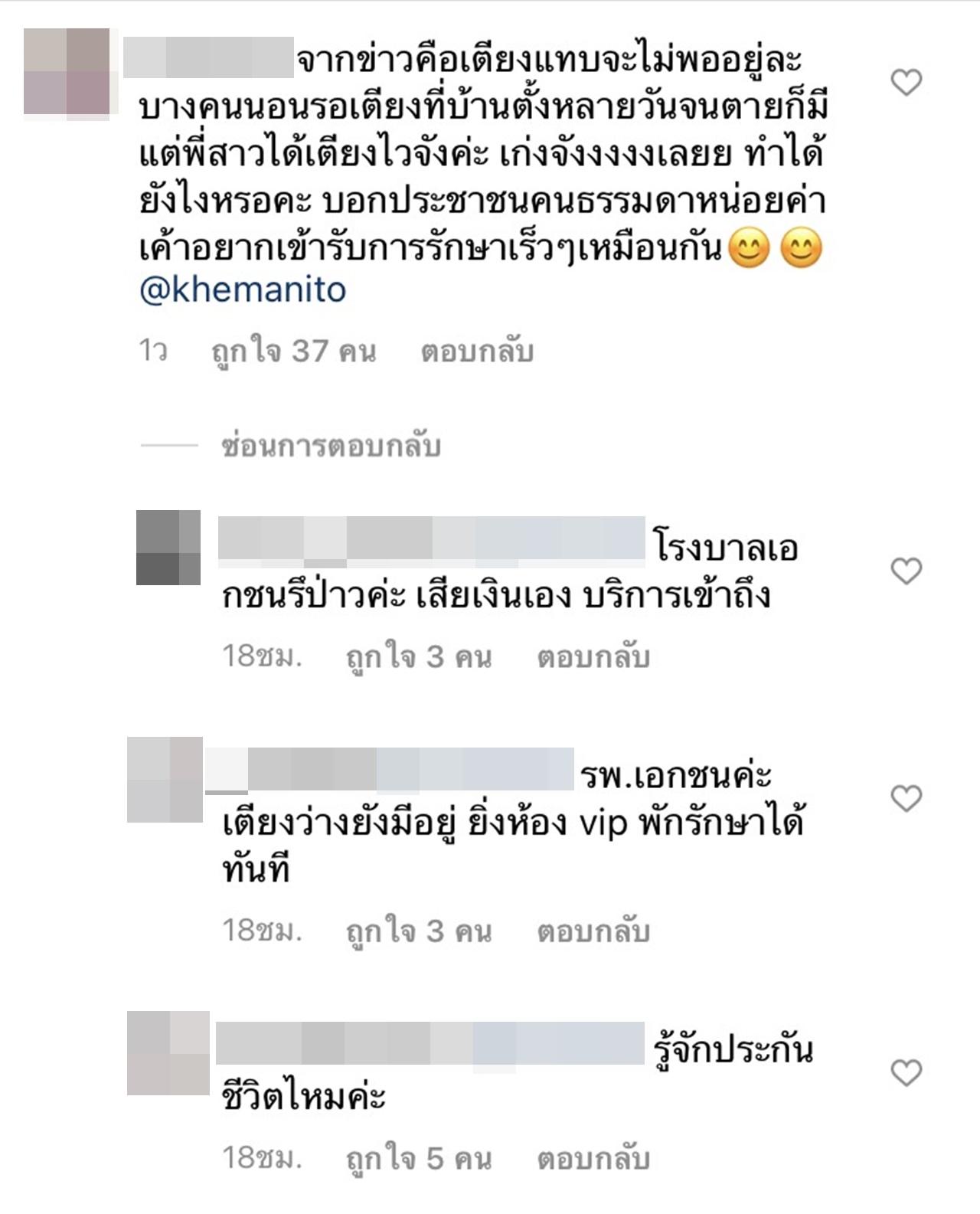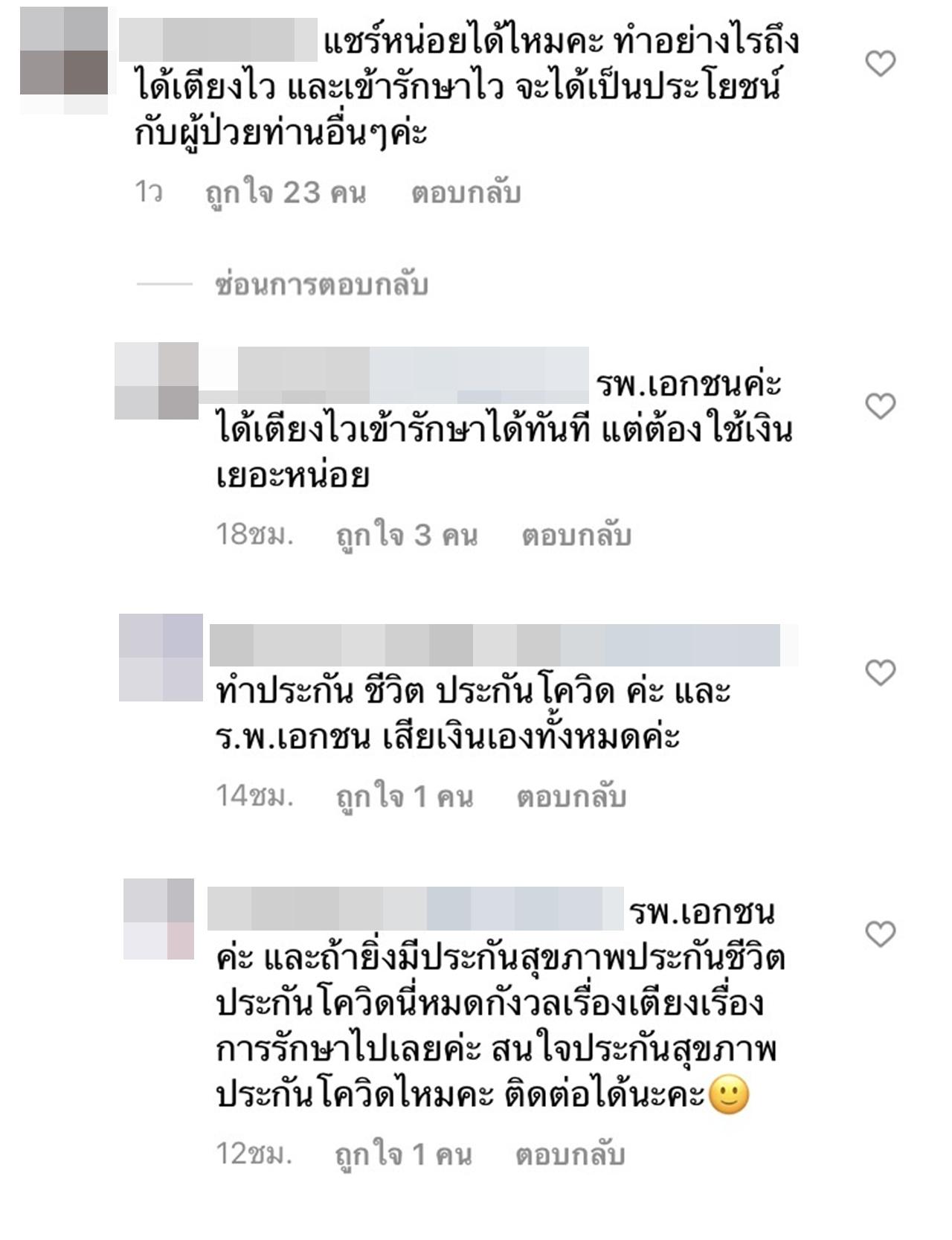 โดยได้เข้ามาสอบถามว่า "ไป รพ. ไหนคับ? ถึงได้เข้ารับการรักษาดูแลตามขั้นตอนของโรงพยาบาลทันทีและอยู่ในความดูแลของแพทย์", "ได้เตียงเร็วดีเหมือนกันนะค้า ติดต่อหน่วยงานไหน โรงพยาบาลอะไรเหรอคะ จะได้ช่วยกระจายข่าวบอกชาวบ้านที่ไม่ได้เตียงบ้าง บางคนรอจนเสียชีวิต", "จากข่าวคือเตียงแทบจะไม่พออยู่ละ บางคนนอนรอเตียงที่บ้านตั้งหลายวันจนตายก็มี แต่พี่สาวได้เตียงไวจังค่ะ เก่งจังเลย ทำได้ยังไงเหรอคะ บอกประชาชนคนธรรมดาหน่อยค่า เค้าอยากเข้ารับการรักษาเร็วๆ เหมือนกัน"