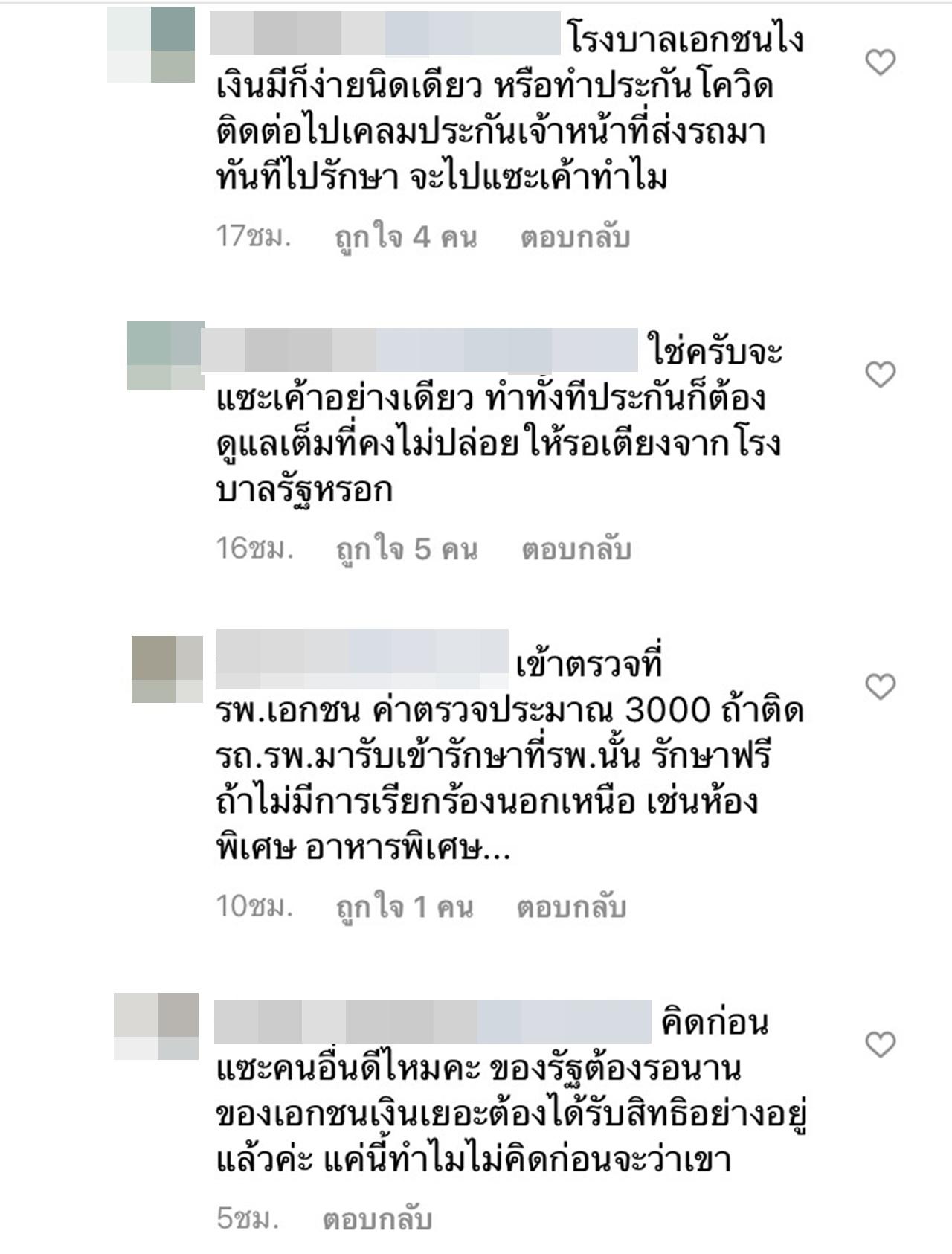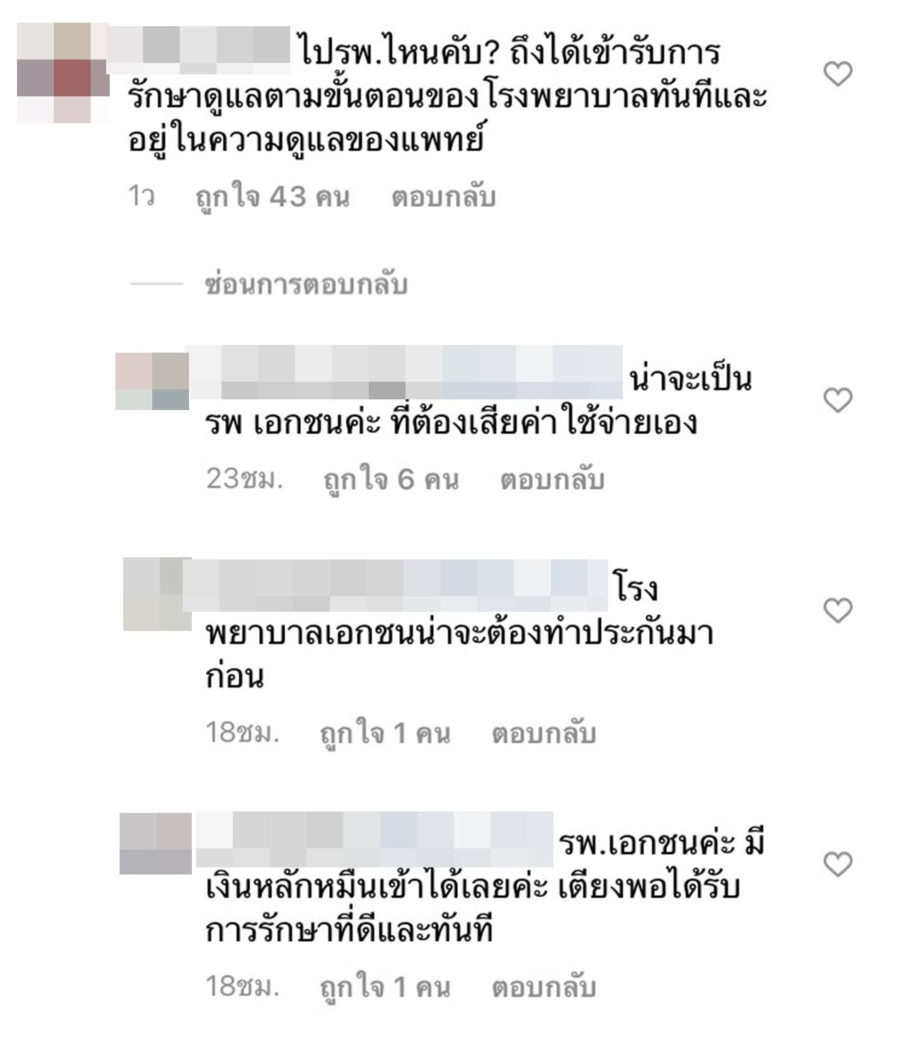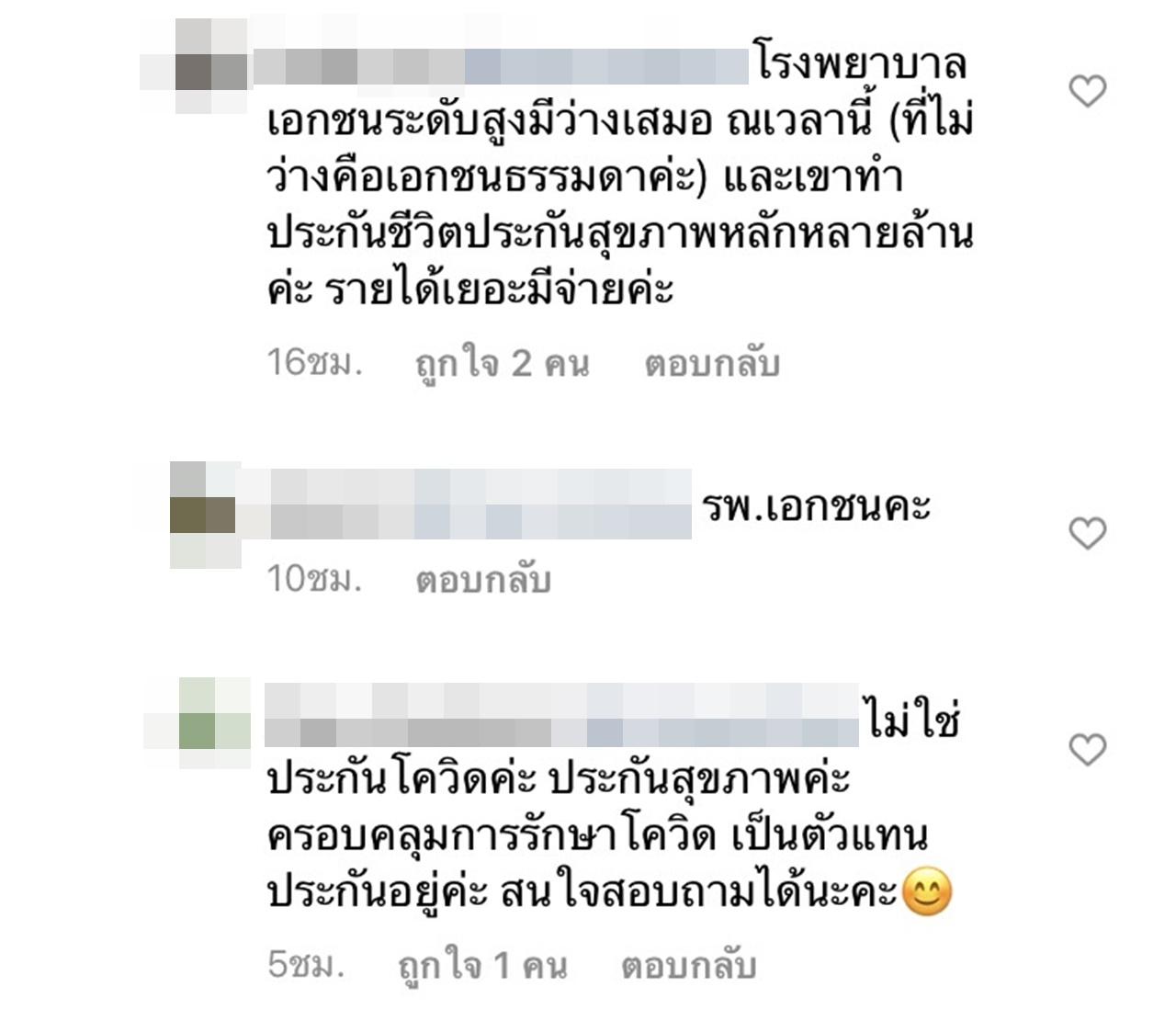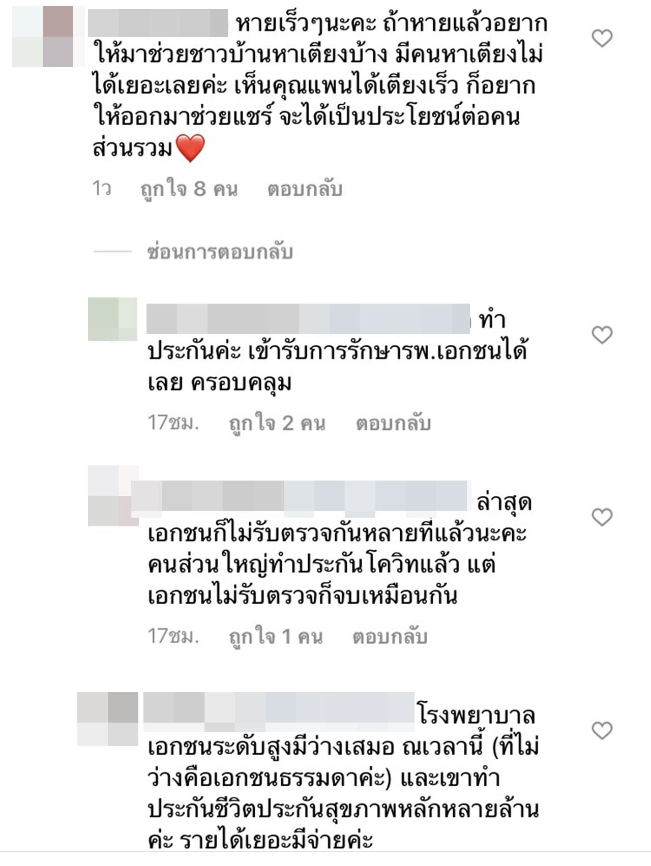 โดยได้เข้ามาสอบถามว่า "ไป รพ. ไหนคับ? ถึงได้เข้ารับการรักษาดูแลตามขั้นตอนของโรงพยาบาลทันทีและอยู่ในความดูแลของแพทย์", "ได้เตียงเร็วดีเหมือนกันนะค้า ติดต่อหน่วยงานไหน โรงพยาบาลอะไรเหรอคะ จะได้ช่วยกระจายข่าวบอกชาวบ้านที่ไม่ได้เตียงบ้าง บางคนรอจนเสียชีวิต", "จากข่าวคือเตียงแทบจะไม่พออยู่ละ บางคนนอนรอเตียงที่บ้านตั้งหลายวันจนตายก็มี แต่พี่สาวได้เตียงไวจังค่ะ เก่งจังเลย ทำได้ยังไงเหรอคะ บอกประชาชนคนธรรมดาหน่อยค่า เค้าอยากเข้ารับการรักษาเร็วๆ เหมือนกัน"