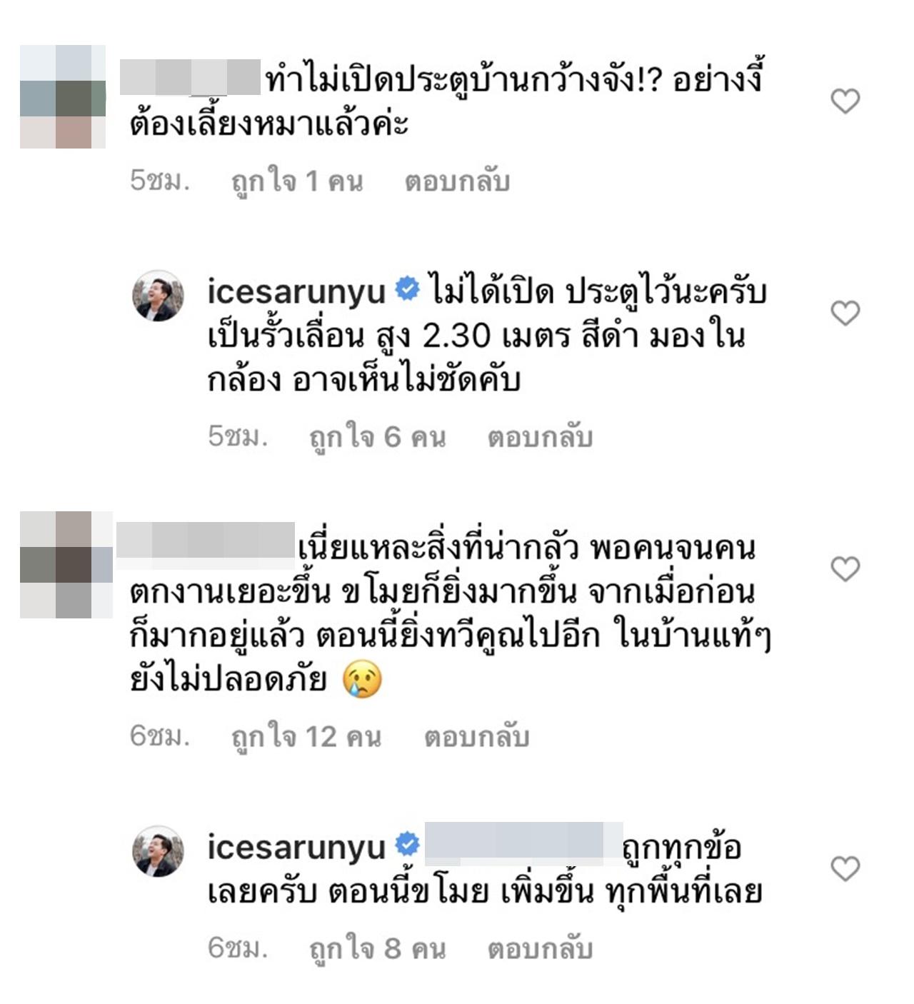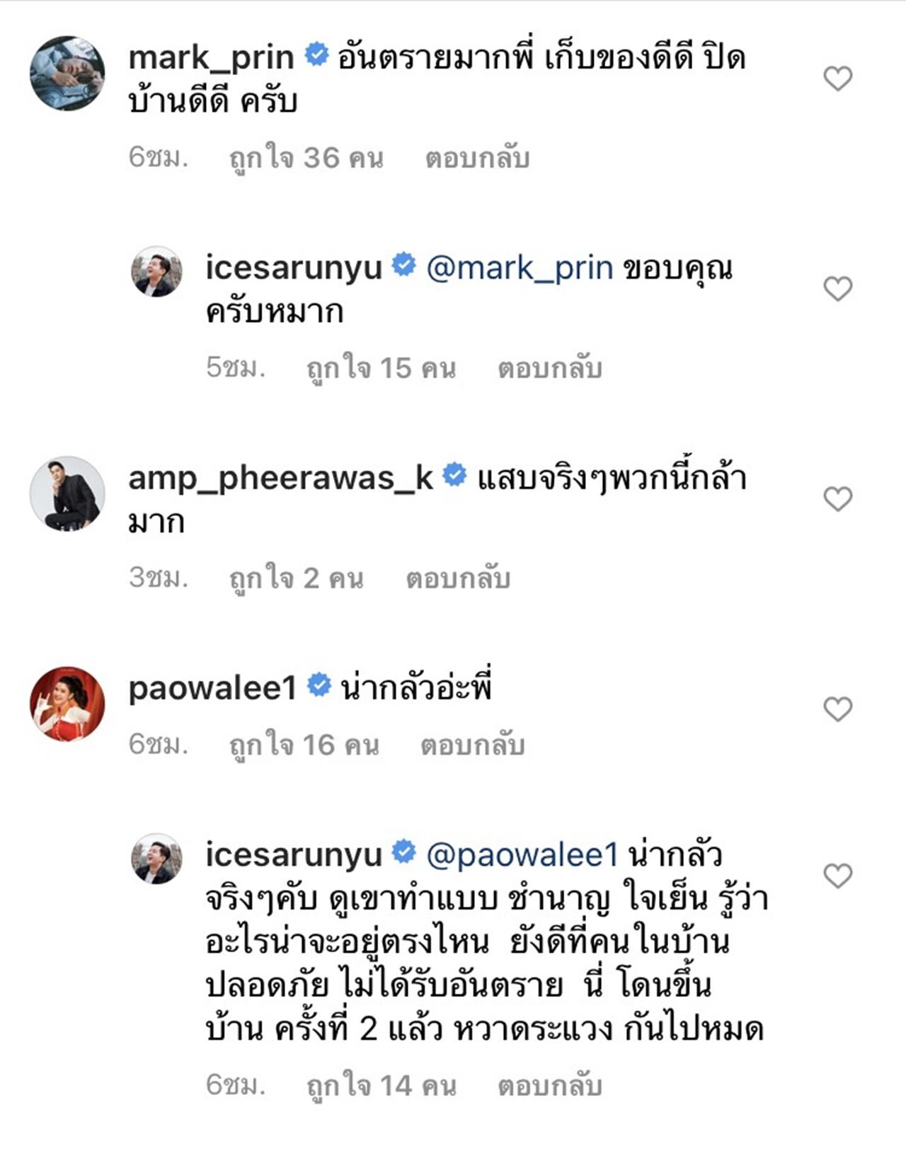 ซึ่งหลังจากที่ ไอซ์ ได้โพสต์เรื่องนี้ ก็มีเพื่อนๆ และแฟนๆ เข้ามาสอบถามและแสดงความเป็นห่วงกันเป็นจำนวนมาก นอกจากนี้ ไอซ์ ได้บอกเพิ่มเติมว่า โจรได้หยิบของมีค่า กระเป๋าสตางค์ออกไปอย่างชำนาญ และใจเย็น เหมือนรู้ว่าอะไรอยู่ตรงไหน แต่ยังโชคดีที่คนในบ้านปลอดภัย ตอนนี้อยู่กันอย่างหวาดระแวงไปหมด.