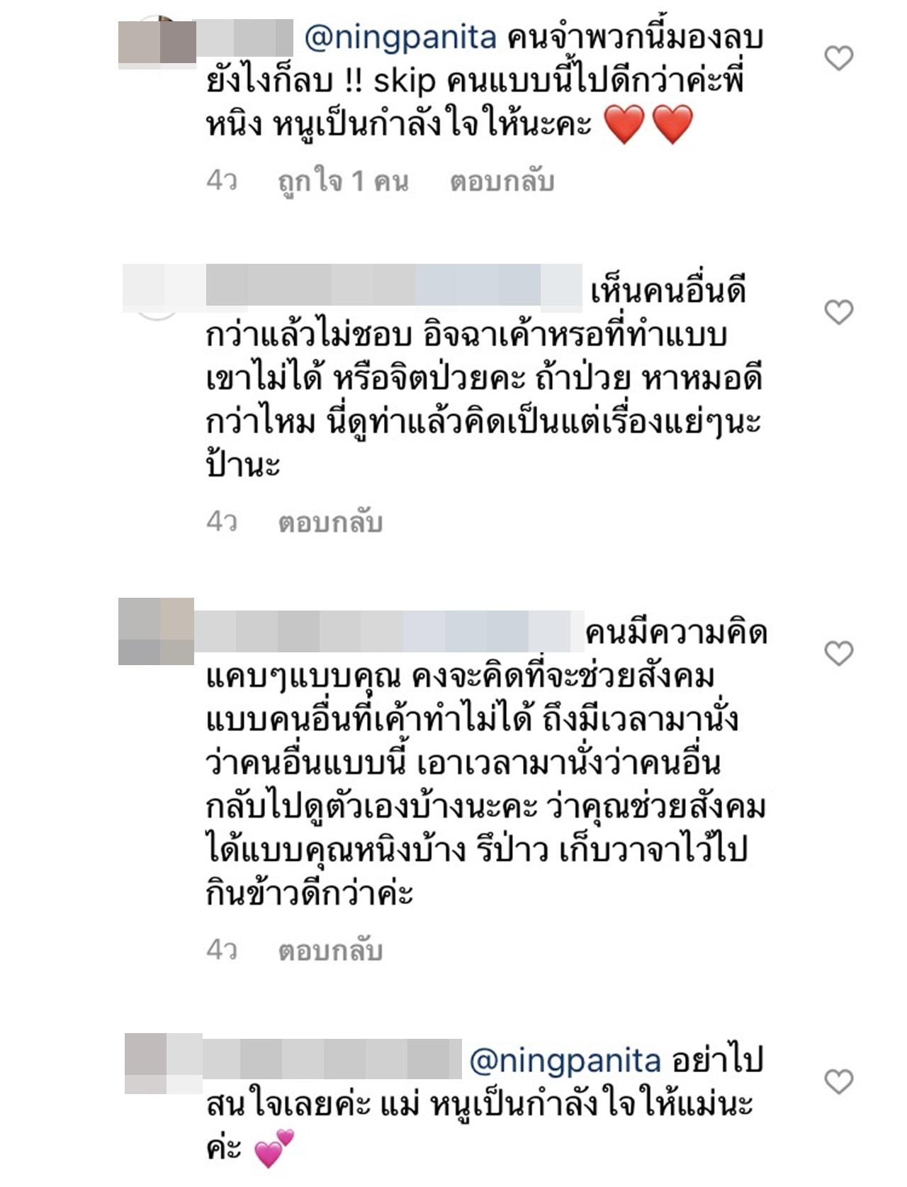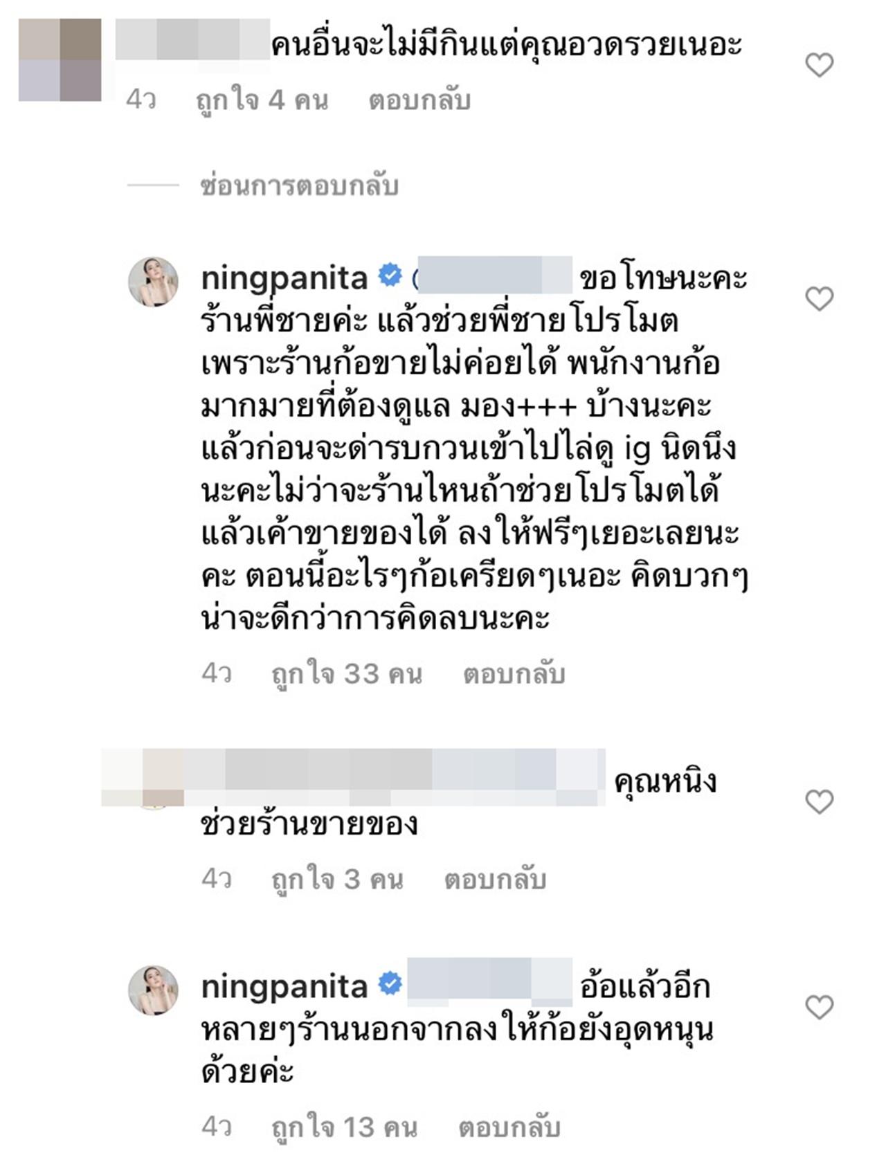 แต่กลับเจอชาวเน็ตที่ไม่เข้าใจ ได้เข้ามาคอมเมนต์ใต้ภาพ โดยเขียนว่า "คนอื่นจะไม่มีกินแต่คุณอวดรวยเนอะ" งานนี้ หนิง อยู่เฉยไม่ได้ รีบเข้าไปเคลียร์แบบด่วนๆ เพื่อไม่ให้เกิดการเข้าใจผิดอีกต่อไป โดยบอกว่า "ขอโทษนะคะ ร้านพี่ชายค่ะ แล้วช่วยพี่ชายโปรโมต เพราะร้านก้อขายไม่ค่อยได้ พนักงานก้อมากมายที่ต้องดูแล มอง+++ บ้างนะคะ แล้วก่อนจะด่ารบกวนเข้าไปไล่ดู ig นิดนึงนะคะไม่ว่าจะร้านไหนถ้าช่วยโปรโมตได้แล้วเค้าขายของได้ ลงให้ฟรีๆเยอะเลยนะคะ ตอนนี้อะไรๆก้อเครียดๆเนอะ คิดบวกๆน่าจะดีกว่าการคิดลบนะคะ"