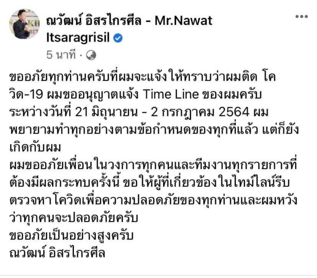"ขอให้ผู้ที่เกี่ยวข้องในไทม์ไลน์ รีบตรวจหาโควิดเพื่อความปลอดภัยของทุกท่าน และผมหวังว่าทุกคนจะปลอดภัยครับ ขออภัยเป็นอย่างสูงครับณวัฒน์ อิสรไกรศีล