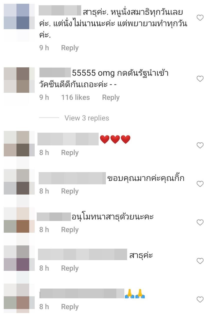 ท่ามกลางคอมเมนต์จากชาวเน็ตที่เข้ามาอนุโมทนาสาธุ บ้างก็บอกว่าการรักษาศีล สมาธิ ภาวนา จะช่วยให้เรามีสติในการใช้ชีวิต Social Distancing ใส่หน้ากาก ล้างมือบ่อยๆ พร้อมทั้งขอให้ทุกคนปลอดภัย แต่ก็มีชาวเน็ตหลายคนตั้งข้อสงสัยและแสดงความคิดเห็น อาทิ สวดมนต์แล้ววัคซีนจะหายไปจากพวกเราใช่มั้ยคะ, ขอนุญาตถามนะคะ ไวรัสโควิดเป็นสิ่งมีชีวิตประเภทไหน และสามารถรับบุญจากเราได้ยังไงคะ ป.ล.ถามเพราะไม่รู้และอยากเพิ่มความรู้ไม่ได้กวนนะคะ ขอบคุณค่ะ, 55555 omg กดดันรัฐนําเข้าวัคซีนดีดีกันเถอะค่ะ ฯลฯ