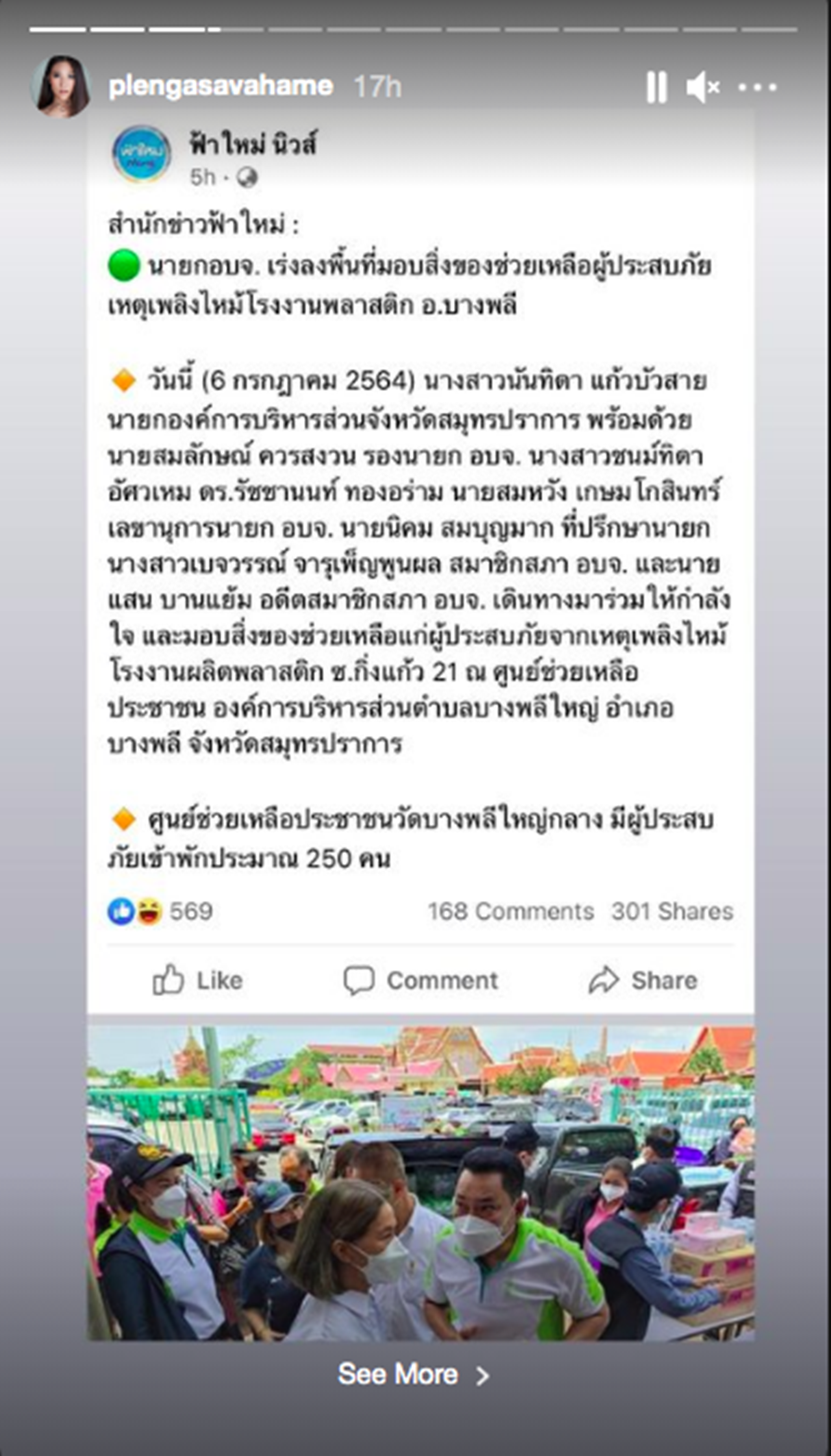 แต่ในเช้าวันต่อมา ตู่ นันทิดา ก็ได้ลงพื้นที่ไปเยี่ยมผู้ที่ได้รับความเดือดร้อน พร้อมกับนำอาหารและของใช้ที่จำเป็นไปมอบให้ด้วย พร้อมกับให้สัมภาษณ์ว่า ทีมงานทำงานกันเป็นทีม อาจไม่เห็นตนลงพื้นที่ เพราะมีปัญหาโควิด แต่เราทำงานตามความเป็นจริง และตนไม่ได้เล่นโซเชียล ยันทำตามหน้าที่ของ อบจ. อะไรช่วยได้ก็ช่วย
