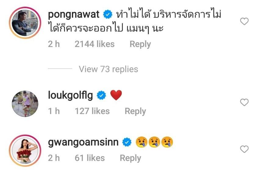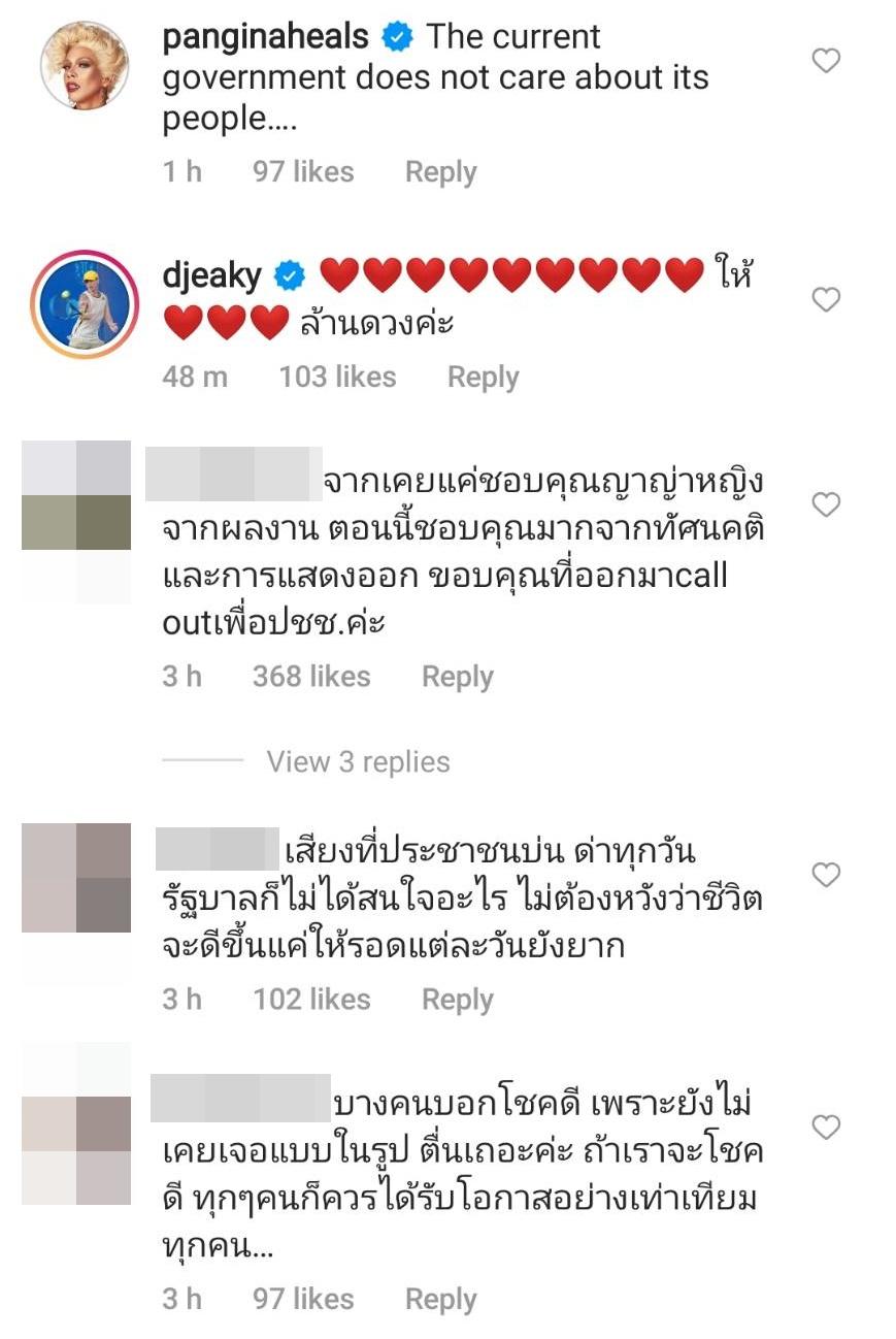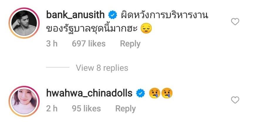 ท่ามกลางกระแสวิพากษ์วิจารณ์อย่างหนักกับสิ่งที่เกิดขึ้นในประเทศไทย ด้านคนบันเทิงอย่างพระเอกหนุ่ม ป้อง ณวัฒน์ กุลรัตนรักษ์ ก็แสดงความคิดเห็นว่า “ทำไม่ได้ บริหารจัดการไม่ได้ก็ควรจะออกไป แมนๆ นะ” รวมไปถึงนักแสดง-นายแบบหนุ่ม แบงค์ อนุสิทธิ แสงนิ่มนวล ที่บอกว่า “ผิดหวังการบริหารงานของรัฐบาลชุดนี้มากฮะ” ด้านดีเจ-พิธีกรดัง เอกกี้ เอกชัย เอื้อสังคมเศรษฐ์ ก็บอกว่า “ให้ใจล้านดวงค่ะ” ฯลฯ