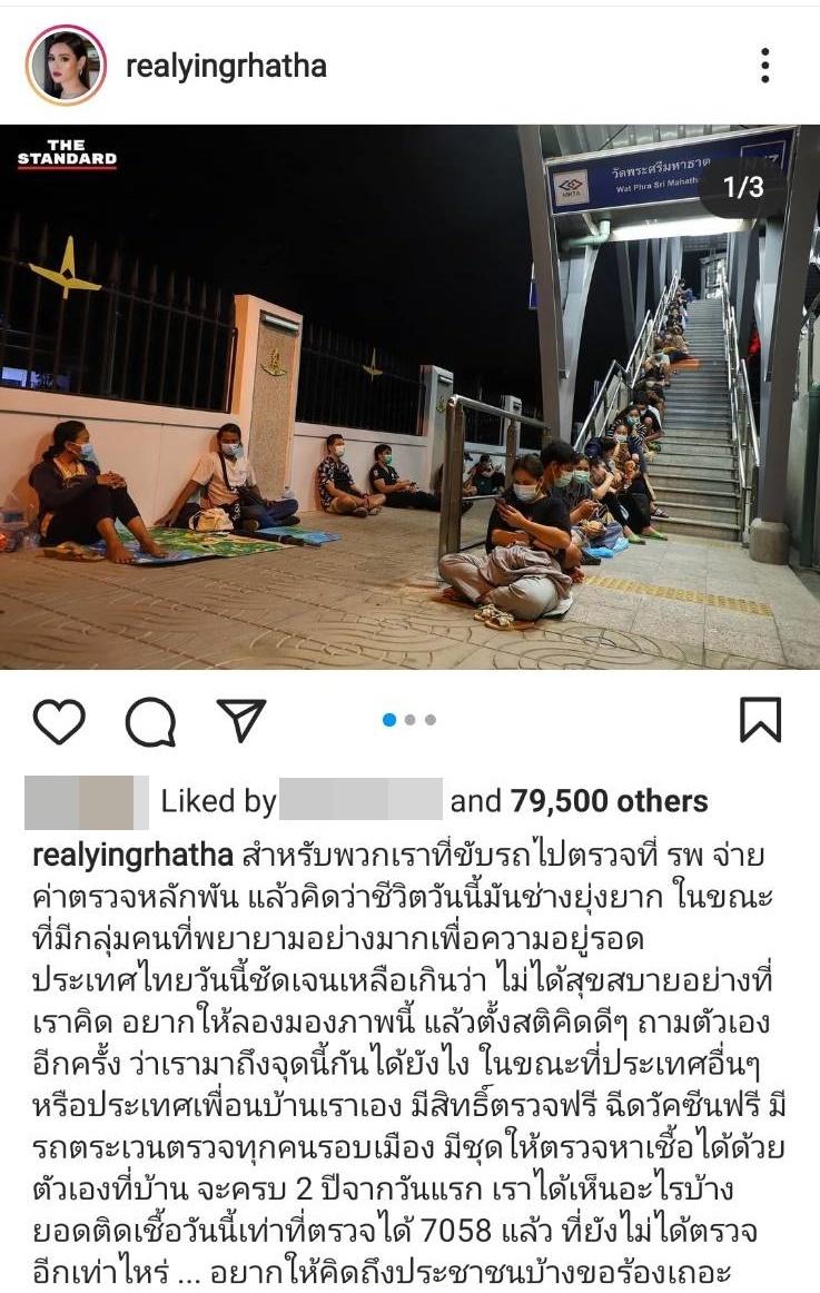 ล่าสุดนักแสดงสาว หญิง รฐา โพธิ์งาม ได้โพสต์ภาพบรรยากาศผู้คนไปนอนรอคิวตรวจโควิดตั้งแต่ช่วงค่ำของวันที่ 7 ก.ค. เข้าสู่วันที่ 8 ก.ค. กลายเป็นแถวยาวไปจนถึงบันไดรถไฟฟ้าบีทีเอส พร้อมทั้งเขียนข้อความว่า “สำหรับพวกเราที่ขับรถไปตรวจที่ รพ. จ่ายค่าตรวจหลักพัน แล้วคิดว่าชีวิตวันนี้มันช่างยุ่งยาก ในขณะที่มีกลุ่มคนที่พยายามอย่างมากเพื่อความอยู่รอด ประเทศไทยวันนี้ชัดเจนเหลือเกินว่า ไม่ได้สุขสบายอย่างที่เราคิด