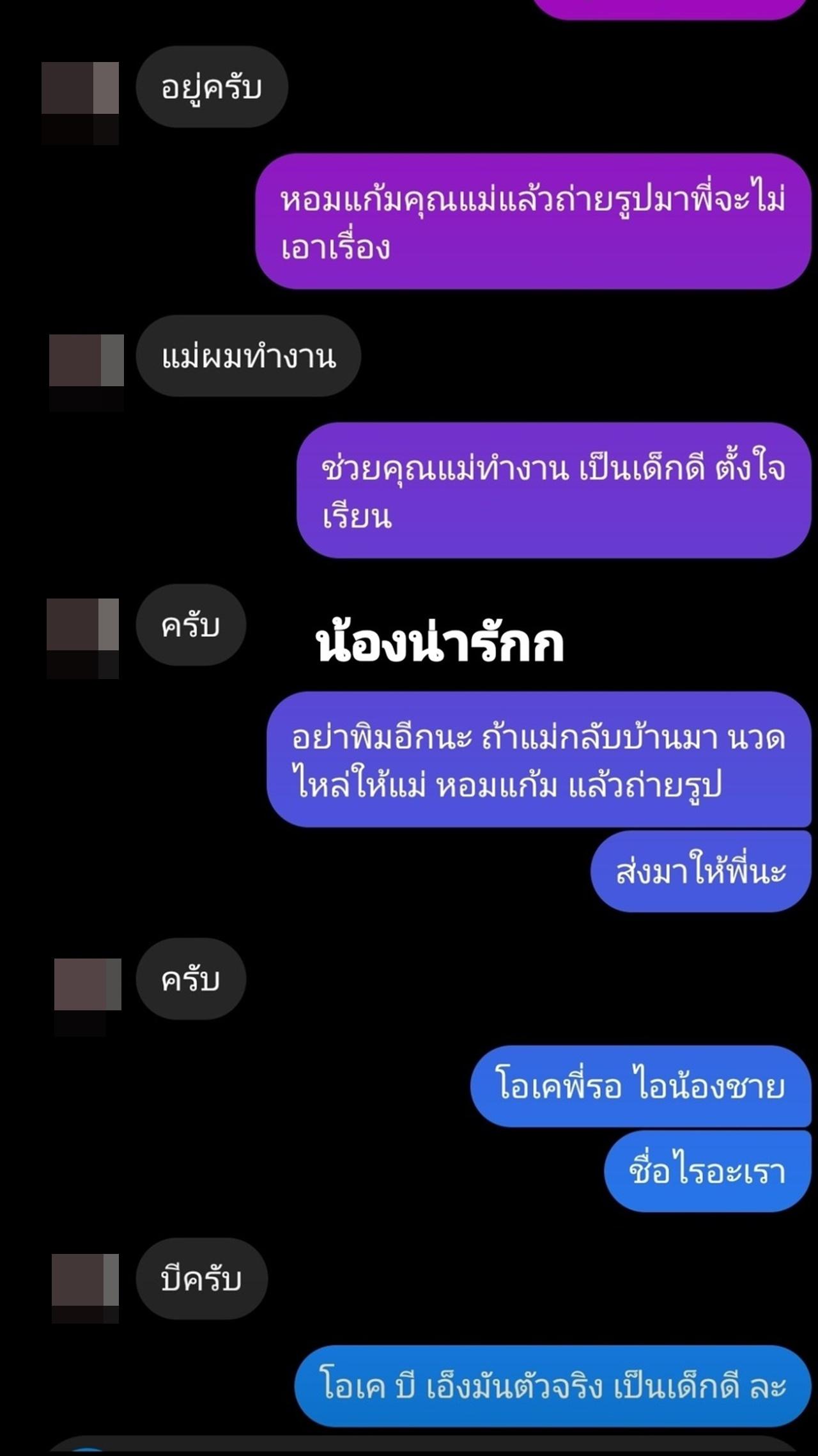 ซึ่งน้องก็บอกว่า แม่ทำงาน กิตเลยบอกให้รอแม่กลับ มาช่วยแม่ทำงานบ้าน นวดไหล่ให้แม่ หอมแก้มแม่แล้วส่งภาพมา จากนั้นไม่นาน น้องคนนั้นก็ได้ส่งภาพตัวเองถ่ายคู่กับแม่ส่งมาให้ กิต และเรื่องนี้ก็จบลงแบบแฮปปี้เอนดิ้ง.
