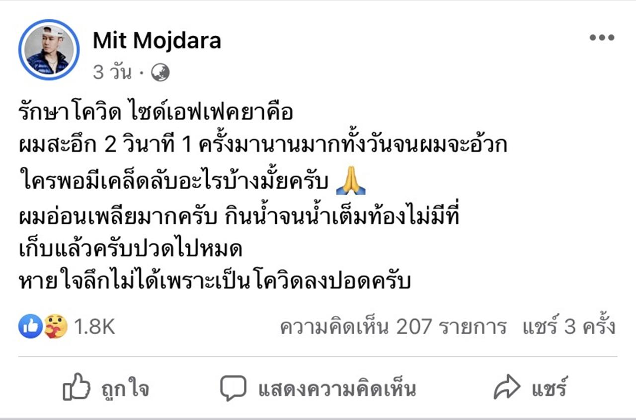 ผมอ่อนเพลียมากครับ กินน้ำจนน้ำเต็มท้องไม่มีที่เก็บแล้วครับปวดไปหมด หายใจลึกไม่ได้เพราะเป็นโควิดลงปอดครับ"