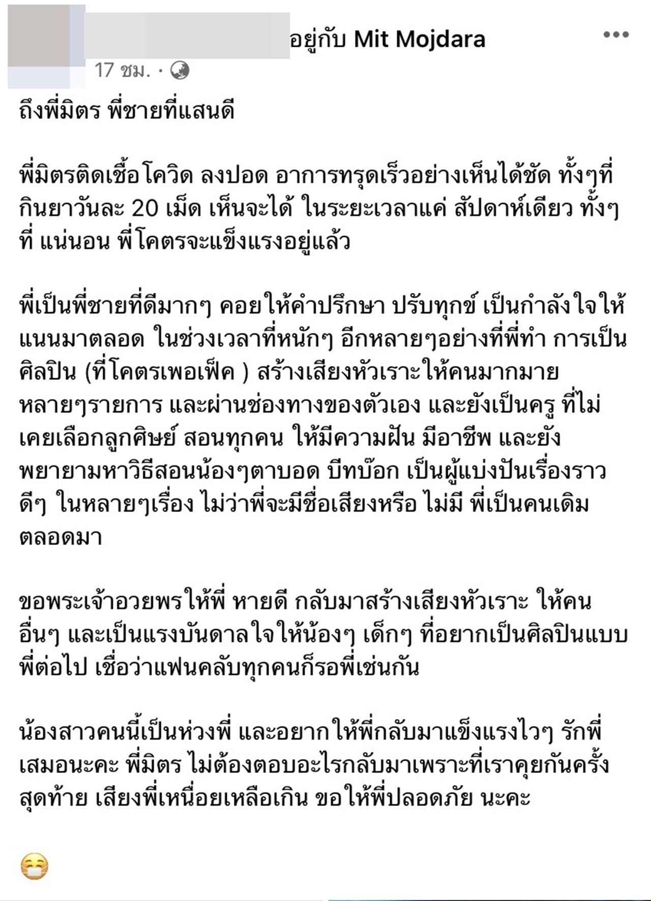 หลังจากที่ มิตร ได้เข้ารักษาตัวในโรงพยาบาล ในวันที่ 11 ก.ค.ที่ผ่านมา เจ้าตัวก็ได้อัปเดตอาการหลังจากที่เข้ารักษาโควิด-19 ให้ทุกคนทราบว่า