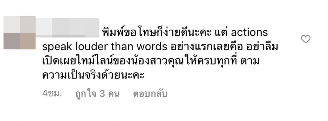 และ พิมพ์ขอโทษก็ง่ายดีนะคะ แต่ actions speak louder than words อย่างแรกเลยคือ อย่าลืมเปิดเผยไทม์ไลน์ของน้องสาวคุณให้ครบทุกที่ตามความเป็นจริงด้วยนะคะ"