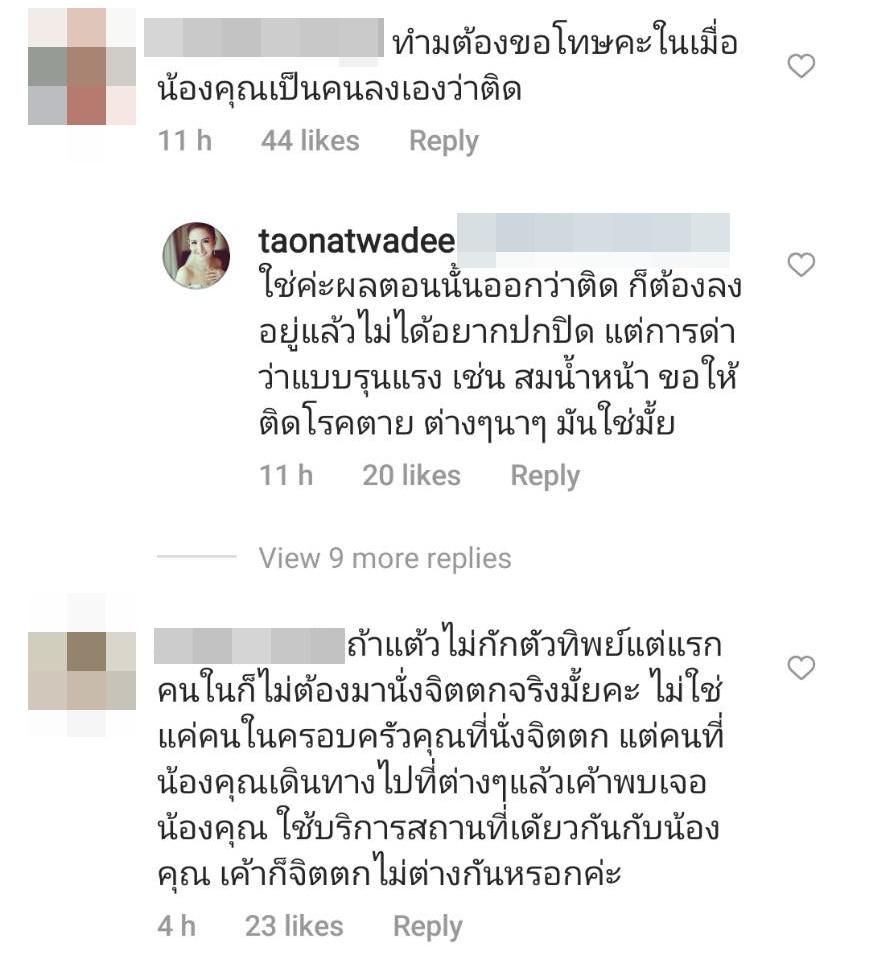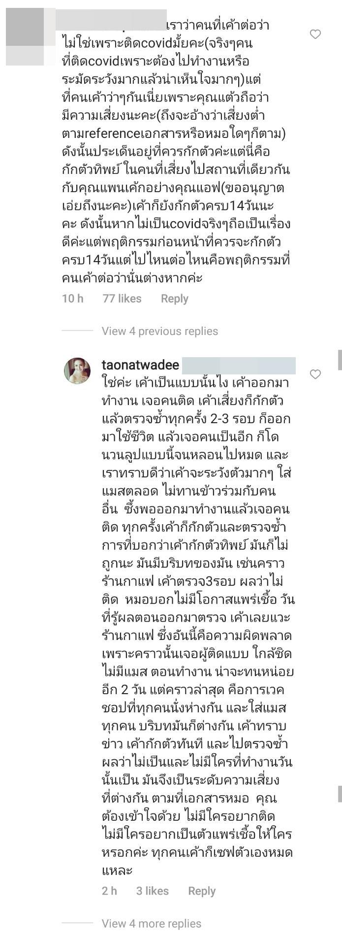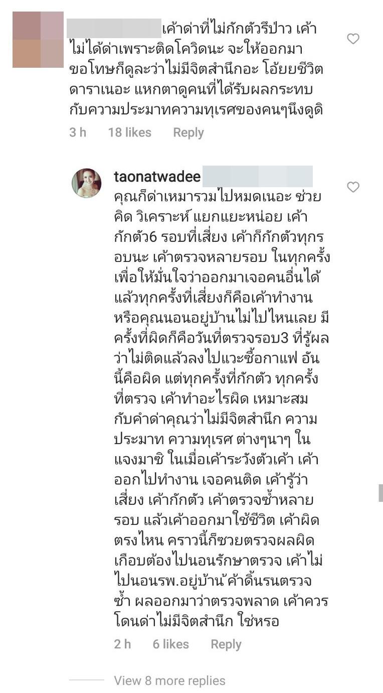 ถ้าแต้วไม่กักตัวทิพย์แต่แรก คนในก็ไม่ต้องมานั่งจิตตกจริงมั้ยคะ ไม่ใช่แค่คนในครอบครัวคุณที่นั่งจิตตก แต่คนที่น้องคุณเดินทางไปที่ต่างๆ แล้วเค้าพบเจอน้องคุณ ใช้บริการสถานที่เดียวกันกับน้องคุณ เค้าก็จิตตกไม่ต่างกันหรอกค่ะ ฯลฯ ซึ่งในบางคอมเมนต์ เต๋าก็เข้าไปตอบกลับด้วย.