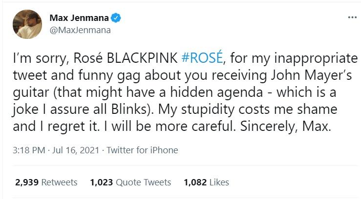 ก่อนจะทวีตขอโทษโรเซ่เป็นภาษาอังกฤษไว้ว่า “I’m sorry, Rosé BLACKPINK #ROSÉ, for my inappropriate tweet and funny gag about you receiving John Mayer’s guitar (that might have a hidden agenda - which is a joke I assure all Blinks). My stupidity costs me shame and I regret it. I will be more careful. Sincerely, Max.”