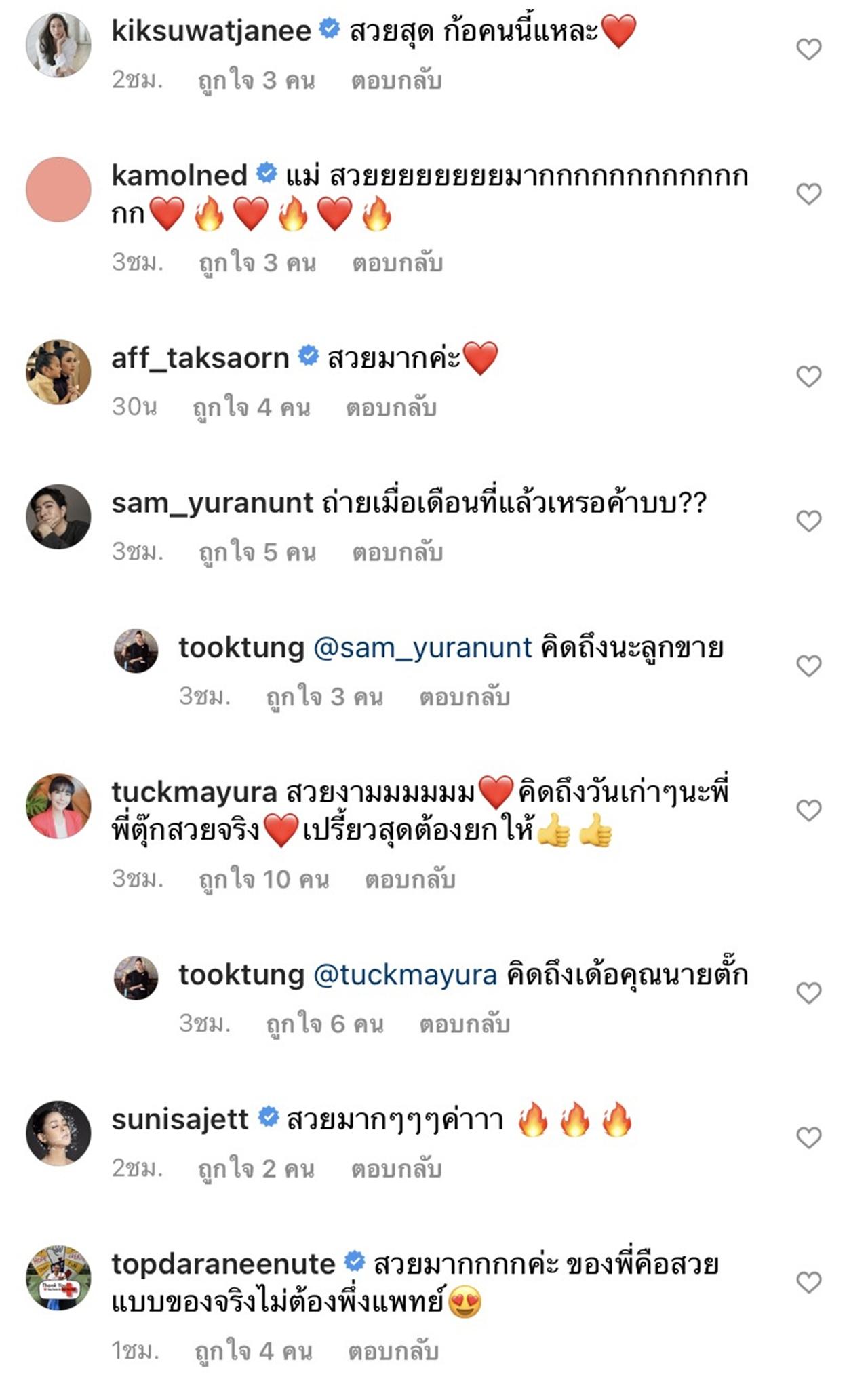 หลังจากที่ ตุ๊ก ดวงตา โพสต์รูปดังกล่าวไป ก็มีคนในวงการบันเทิงเข้ามาคอมเมนต์ชมมากมายอาทิ "แม่ สวยยยยยยยยมากกกกกกกกกกกกกก, สวยสุด ก้อคนนี้แหละ, สวยมากกกกค่ะ ของพี่คือสวยแบบของจริงไม่ต้องพึ่งแพทย์, สวยงามมมมมม คิดถึงวันเก่าๆ นะพี่ พี่ตุ๊กสวยจริง เปรี้ยวสุดต้องยกให้, ถ่ายเมื่อเดือนที่แล้วเหรอค้าบบ??"