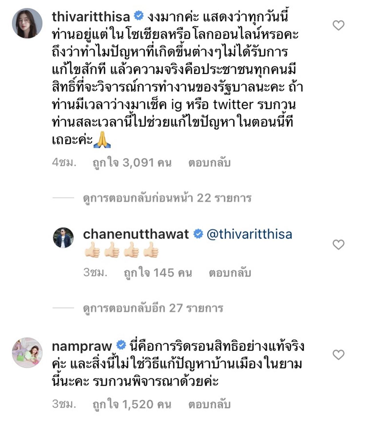 ฐิสา วริฏฐิสา ได้เขียนแสดงความคิดเห็นเกี่ยวกับเรื่องนี้ว่า "งงมากค่ะ แสดงว่าทุกวันนี้ท่านอยู่แต่ในโซเชียลหรือโลกออนไลน์เหรอคะ ถึงว่าทำไมปัญหาที่เกิดขึ้นต่างๆ ไม่ได้รับการแก้ไขสักที แล้วความจริงคือประชาชนทุกคนมีสิทธิ์ที่จะวิจารณ์การทำงานของรัฐบาลนะคะ ถ้าท่านมีเวลาว่างมาเช็ก ig หรือ twitter รบกวนท่านสละเวลานี้ไปช่วยแก้ไขปัญหาในตอนนี้ทีเถอะค่ะ"