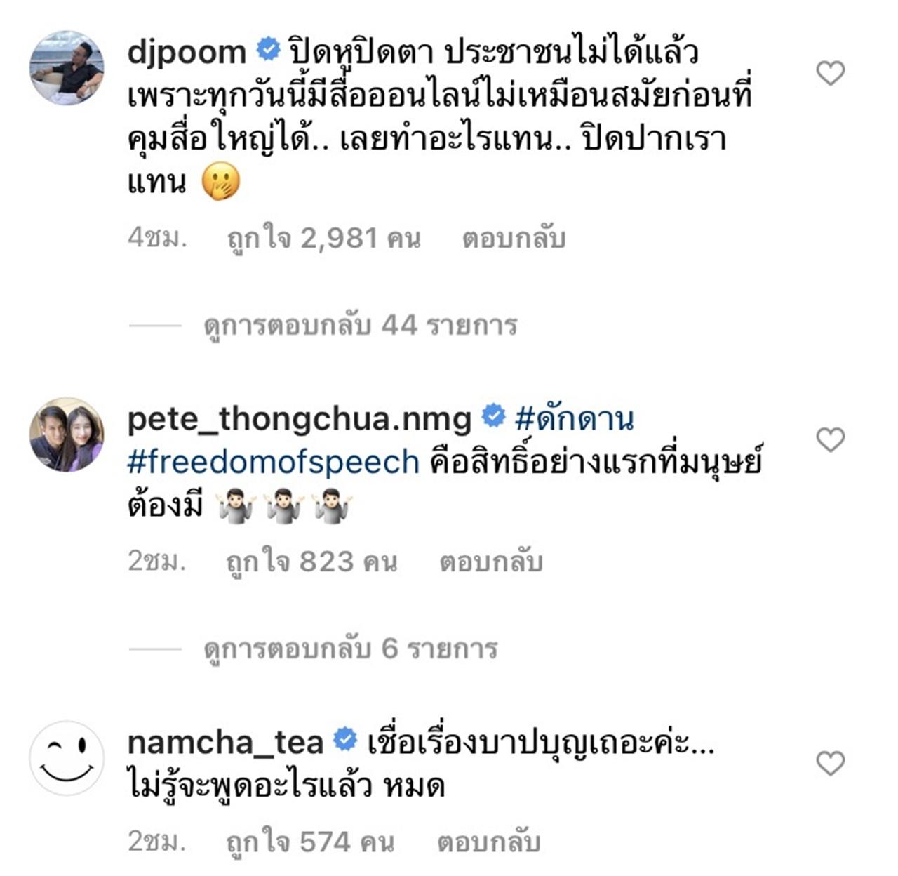 ด้าน ดีเจภูมิ ภูมิใจ ตั้งสง่า ก็ได้คอมเมนต์ว่า "ปิดหูปิดตาประชาชนไม่ได้แล้ว เพราะทุกวันนี้มีสื่อออนไลน์ ไม่เหมือนสมัยก่อนที่คุมสื่อใหญ่ได้.. เลยทำอะไรแทน.. ปิดปากเราแทน"