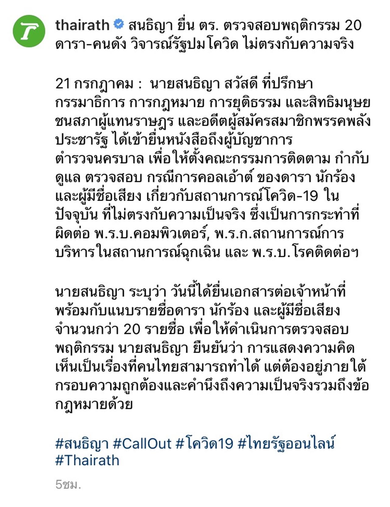 หลังจากที่มีข่าวออกมาว่า นายสนธิญา สวัสดี ที่ปรึกษากรรมาธิการ การกฎหมาย การยุติธรรม และสิทธิมนุษยชนสภาผู้แทนราษฎร และอดีตผู้สมัครสมาชิกพรรคพลังประชารัฐ ได้เข้ายื่นหนังสือถึงผู้บัญชาการตำรวจนครบาล เพื่อให้ตั้งคณะกรรมการติดตาม กำกับ ดูแล ตรวจสอบ กรณีการคอลเอาต์ ของดารา นักร้อง และผู้มีชื่อเสียง เกี่ยวกับสถานการณ์โควิด-19 ในปัจจุบัน ที่ไม่ตรงกับความเป็นจริง