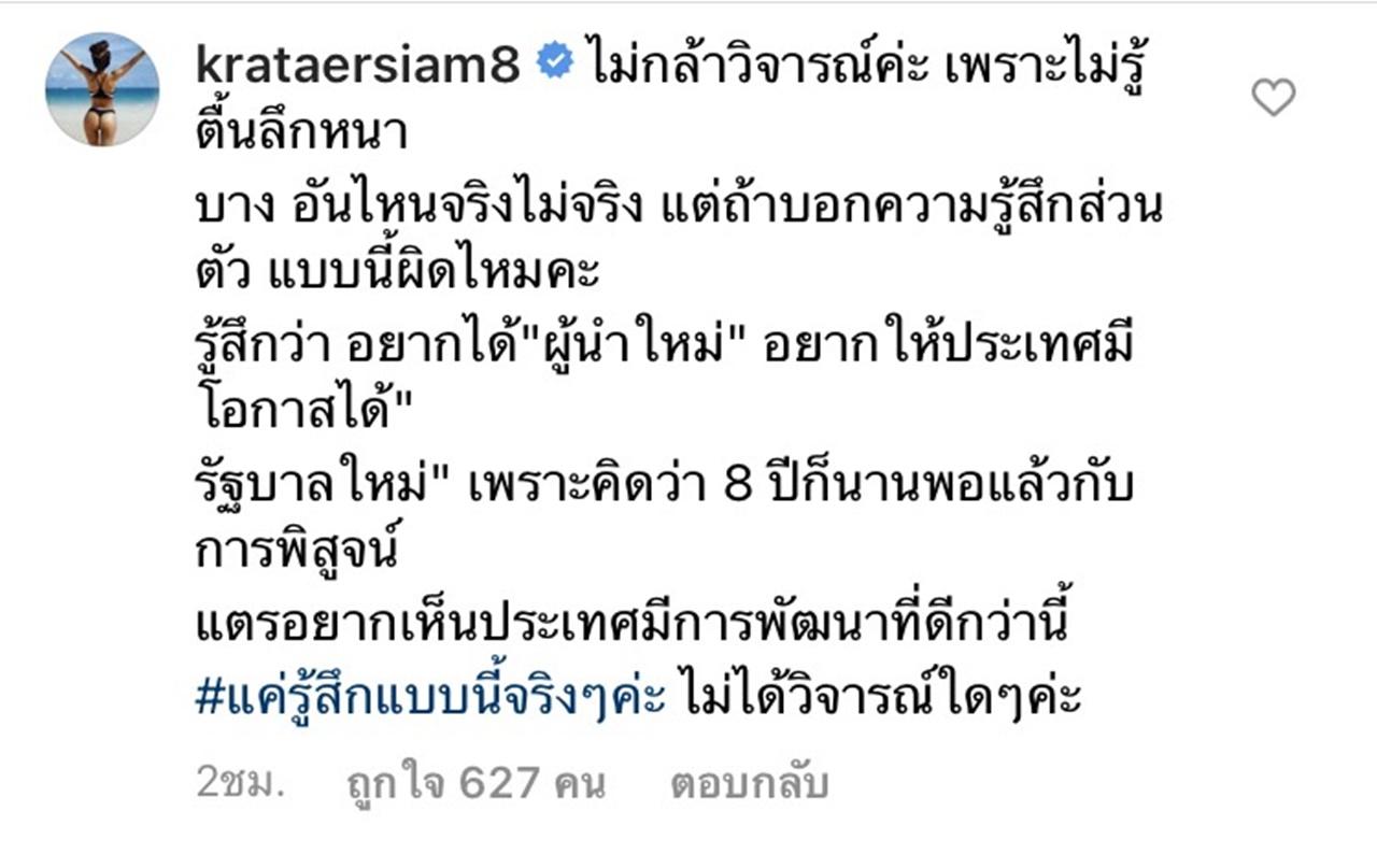แตร อาร์สยาม "ไม่กล้าวิจารณ์ค่ะ เพราะไม่รู้ตื้นลึกหนาบาง อันไหนจริงไม่จริง แต่ถ้าบอกความรู้สึกส่วนตัว แบบนี้ผิดไหมคะ รู้สึกว่า อยากได้ "ผู้นำใหม่" อยากให้ประเทศมีโอกาสได้ "รัฐบาลใหม่" เพราะคิดว่า 8 ปีก็นานพอแล้วกับการพิสูจน์ แตรอยากเห็นประเทศมีการพัฒนาที่ดีกว่านี้ #แค่รู้สึกแบบนี้จริงๆค่ะ ไม่ได้วิจารณ์ใดๆค่ะ"