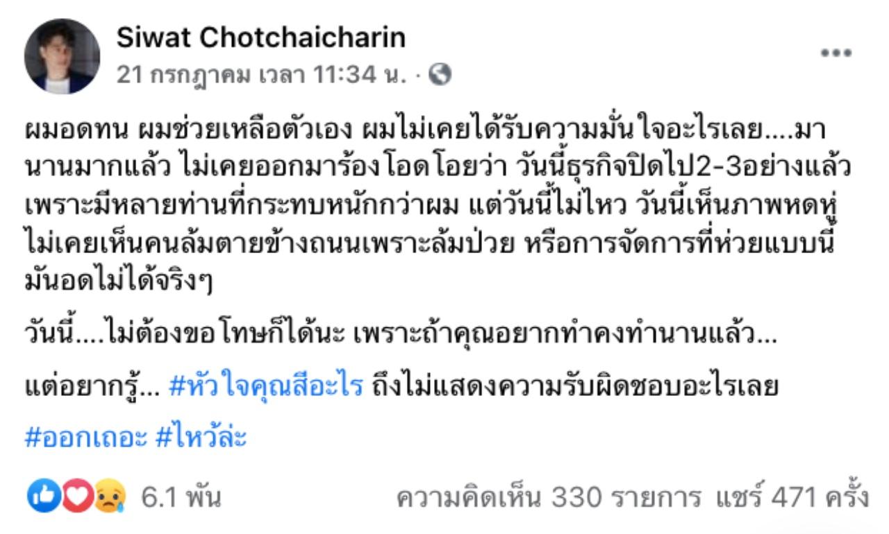 - ผมอดทน ผมช่วยเหลือตัวเอง ผมไม่เคยได้รับความมั่นใจอะไรเลย…มานานมากแล้ว ไม่เคยออกมาร้องโอดโอย ว่าวันนี้ธุรกิจปิดไป 2-3 อย่างแล้ว เพราะมีหลายท่านที่กระทบหนักกว่าผม แต่วันนี้ไม่ไหว