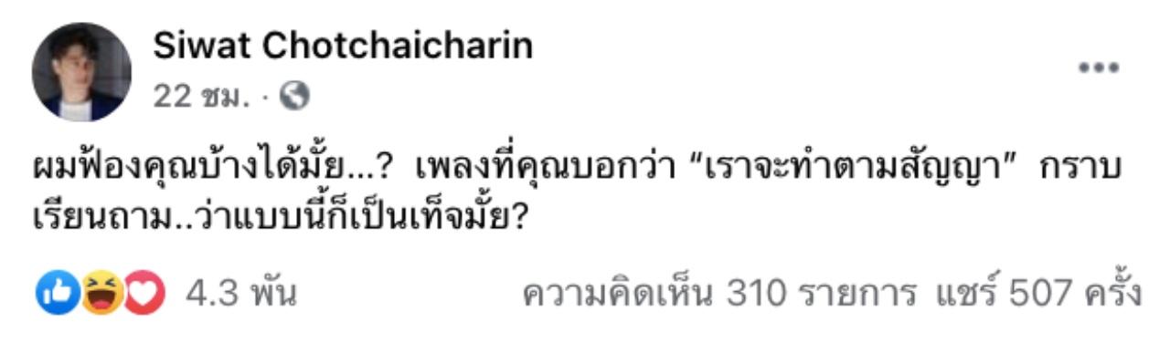 - ผมฟ้องคุณบ้างได้มั้ย…? เพลงที่คุณบอกว่า “เราจะทำตามสัญญา” กราบเรียนถาม...ว่าแบบนี้ ก็เป็นเท็จมั้ย?