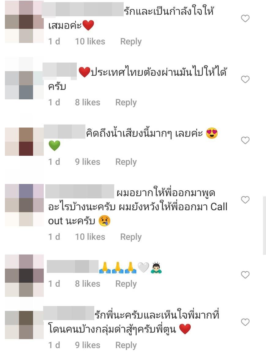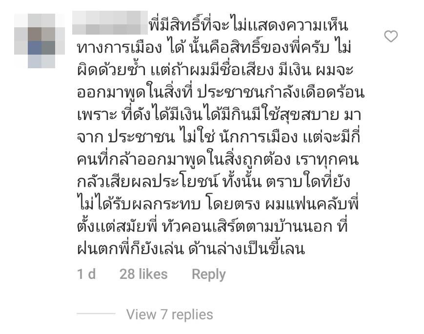แต่ก็มีดราม่าจนได้ เมื่อมีคนเข้ามาคอมเมนต์เรื่องการ Call out อาทิ พี่มีสิทธิ์ที่จะไม่เเสดงความเห็นทางการเมืองได้ นั่นคือสิทธิ์ของพี่ครับ ไม่ผิดด้วยซ้ำ เเต่ถ้าผมมีชื่อเสียง มีเงิน ผมจะออกมาพูดในสิ่งที่ประชาชนกำลังเดือดร้อน เพราะที่ดังได้มีเงินได้มีกินมีใช้สุขสบายมาจากประชาชน ไม่ใช่นักการเมือง แต่จะมีกี่คนที่กล้าออกมาพูดในสิ่งถูกต้อง เราทุกคนกลัวเสียผลประโยชน์ทั้งนั้น ตราบใดที่ยังไม่ได้รับผลกระทบโดยตรง,