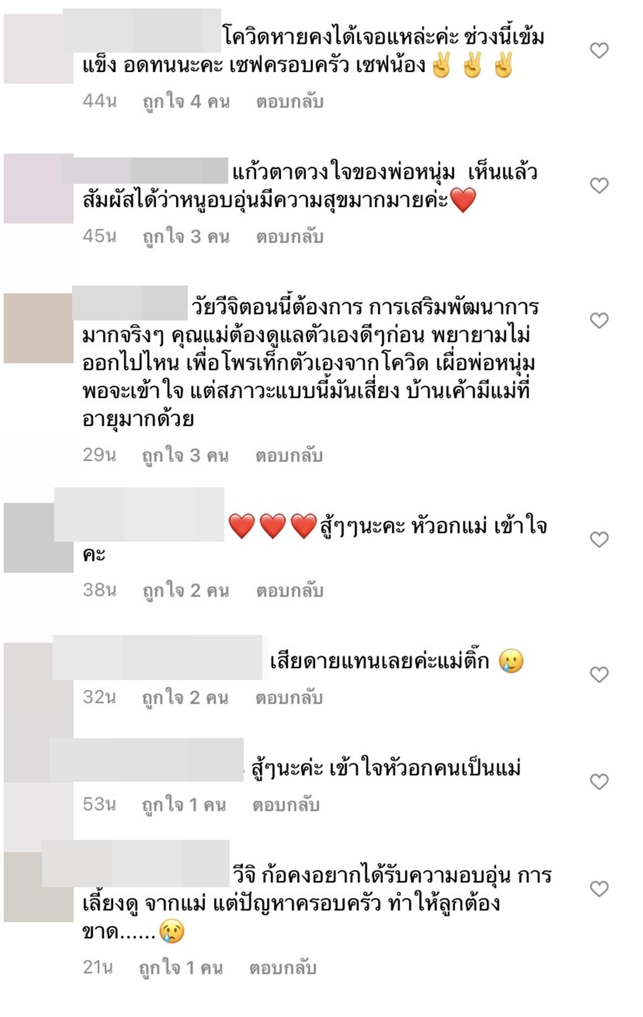 "โควิดหายคงได้เจอแหล่ะค่ะ ช่วงนี้เข้มแข็ง อดทนนะคะ เซฟครอบครัว เซฟน้อง, วัยวีจิตอนนี้ต้องการ การเสริมพัฒนาการมากจริงๆ คุณแม่ต้องดูแลตัวเองดีๆก่อน พยายามไม่ออกไปไหน เพื่อโพรเท็กตัวเองจากโควิด เผื่อพ่อหนุ่มพอจะเข้าใจ แต่สภาวะแบบนี้มันเสี่ยง บ้านเค้ามีแม่ที่อายุมากด้วย,