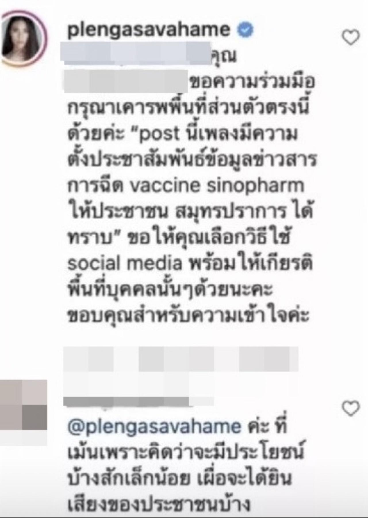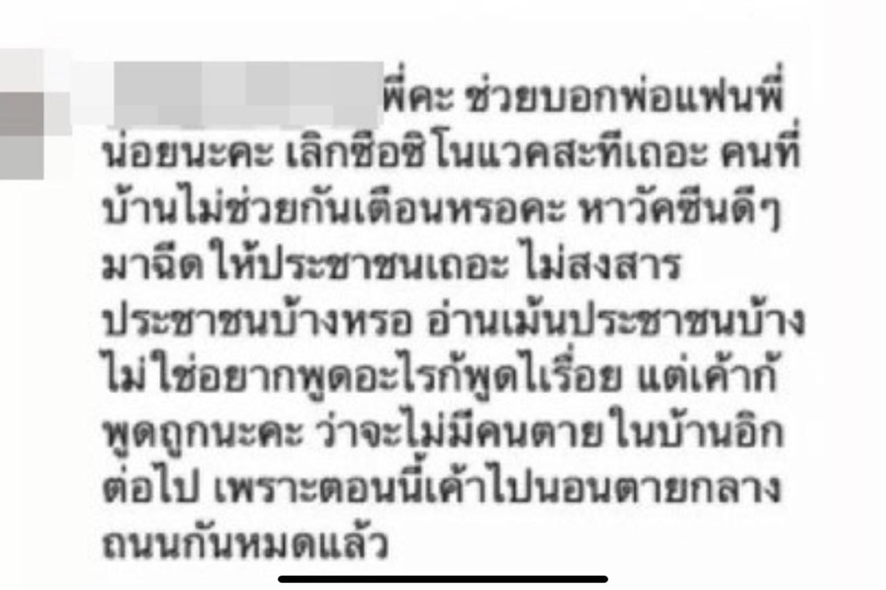 “พี่คะ ช่วยบอกพ่อแฟนพี่หน่อยนะคะ เลิกซื้อวัคซีนซิโนแวคเถอะ คนที่บ้านไม่ช่วยกันเตือนเหรอคะ หาวัคชีนดีๆ มาฉีดให้ประชาชนเถอะ ไม่สงสารประชาชนบ้างเหรอ