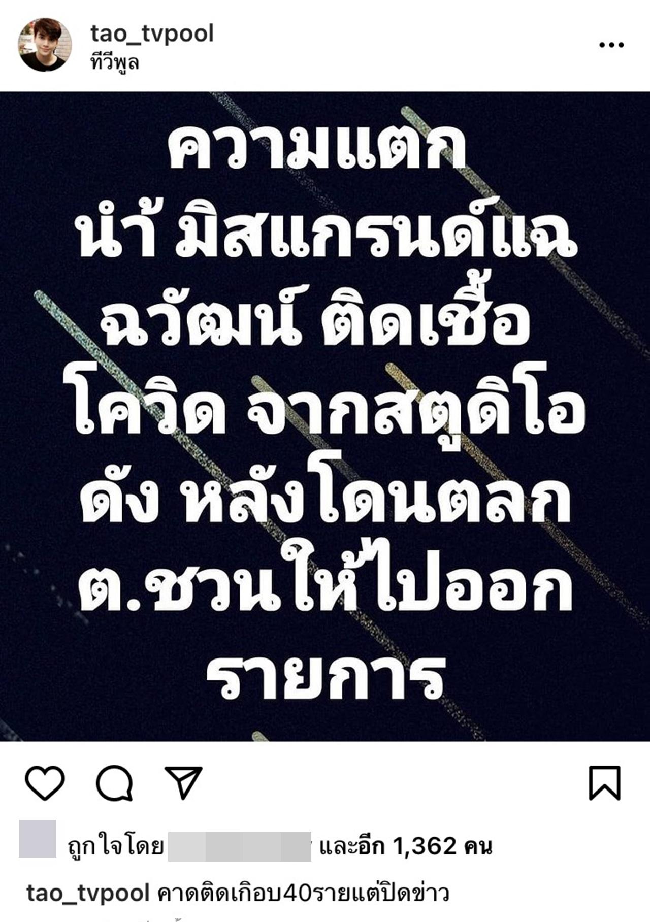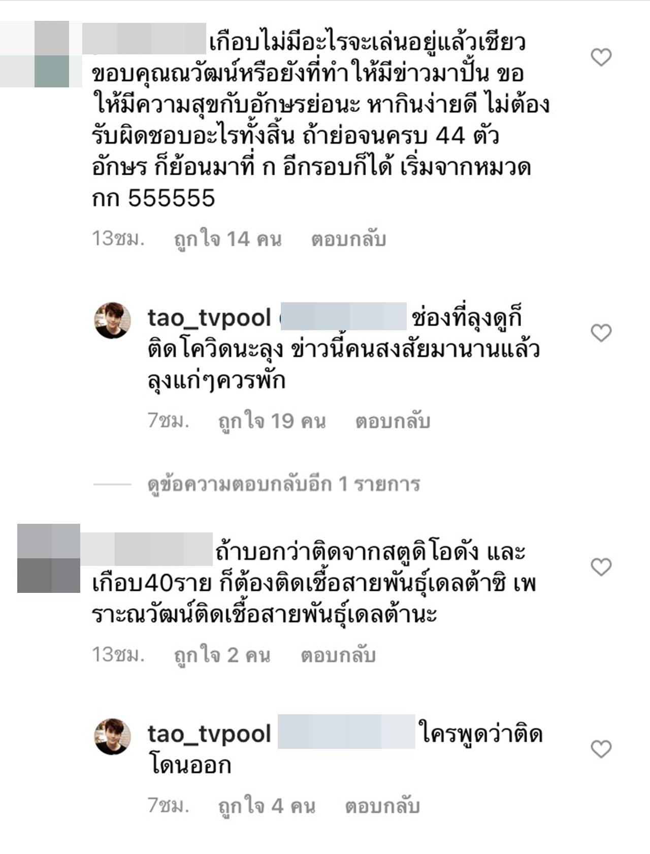 และ เต๋า ก็ได้นำเรื่องนี้มาเขียนผ่านอินสตาแกรมว่า "ความแตก น้ำมิสแกรนด์แฉ ณวัฒน์ ติดเชื้อโควิด จากสตูดิโอดัง หลังโดนตลก ต.ชวนให้ไปออกรายการ" และเขียนต่อว่า "คาดติดเกือบ 40 รายแต่ปิดข่าว"
