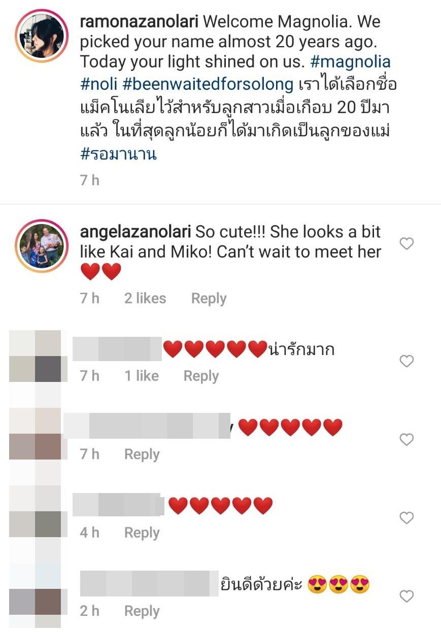 โดยมีทั้งเพื่อนๆ ในวงการบันเทิงและแฟนๆ เข้ามาคอมเมนต์แสดงความยินดี ด้าน แองจี้ แองเจล่า ซาโนลารี่ พี่สาว ก็คอมเมนต์ว่า “So cute!!! She looks a bit like Kai and Miko! Can’t wait to meet her” บันเทิงไทยรัฐออนไลน์ขอแสดงความยินดีด้วยนะคะ.