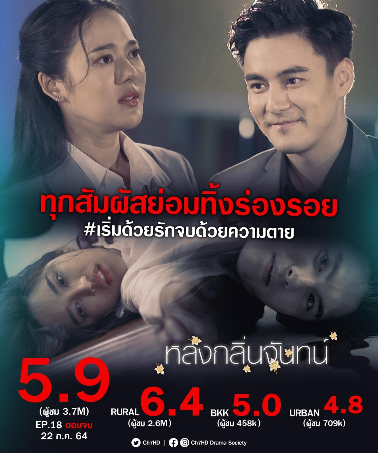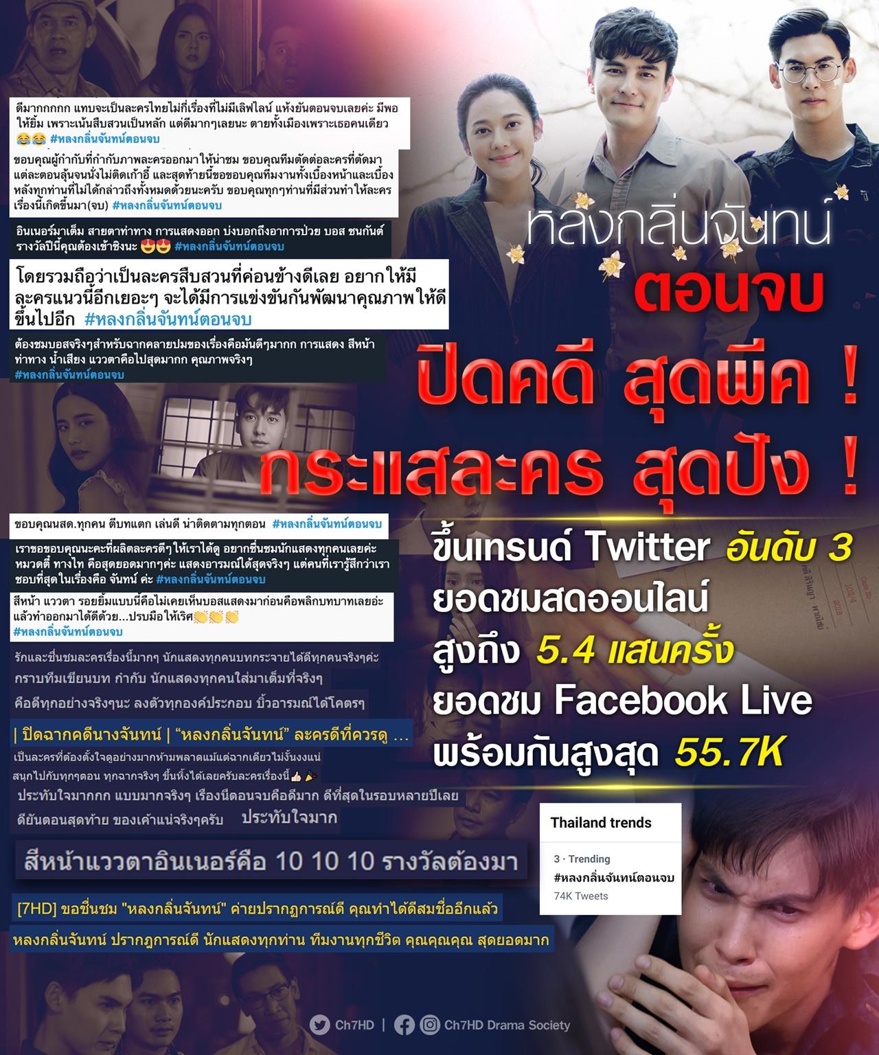 แถมกระแสยังแรงสนั่นโซเชียล แฮชแท็ก #หลงกลิ่นจันทน์ตอนจบ ขึ้นเทรนด์ Twitter ไทยแลนด์ อันดับ 3 และมียอดชมสดออนไลน์ สูงถึง 5.4 แสนครั้ง ยอดชม Facebook Live พร้อมกันสูงสุด 55.7K