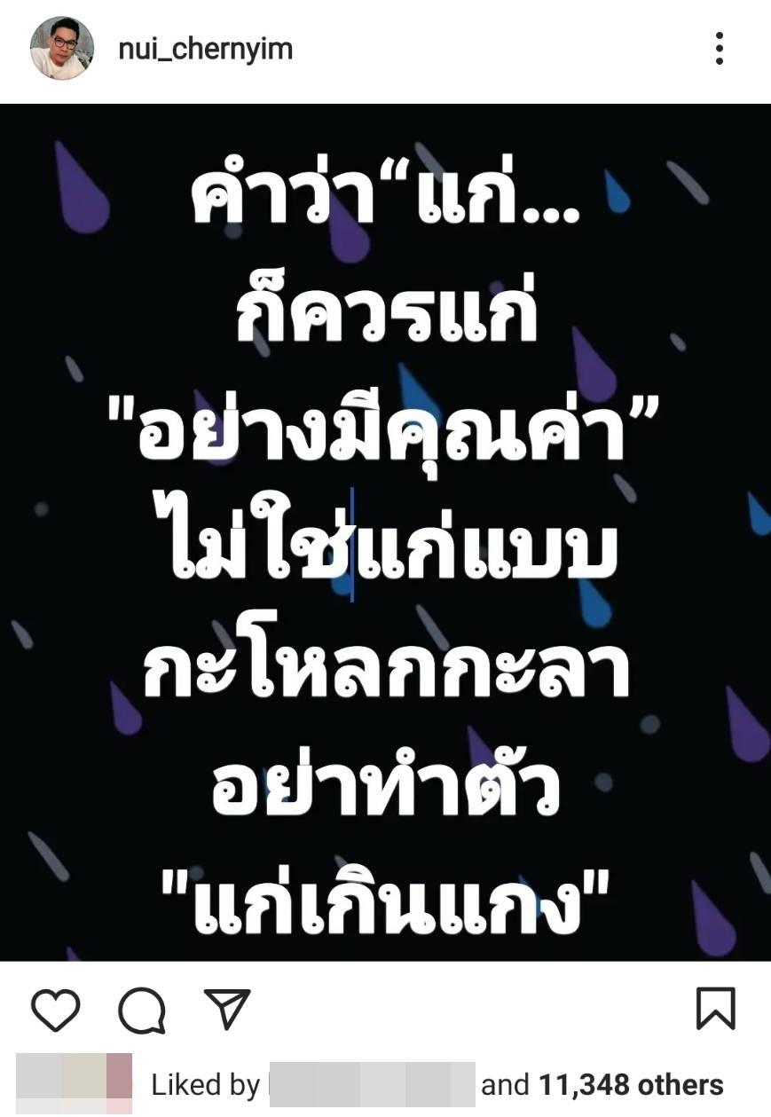 แต่ล่าสุด นุ้ย เชิญยิ้ม โพสต์ข้อความที่ทำให้คนติดตามอินสตาแกรมมีสะดุ้งไปตามๆ กัน โดยบอกว่า “คำว่าแก่ก็ควรแก่อย่างมีคุณค่า ไม่ใช่แก่แบบกะโหลกกะลา อย่าทำตัว แก่เกินแกง”