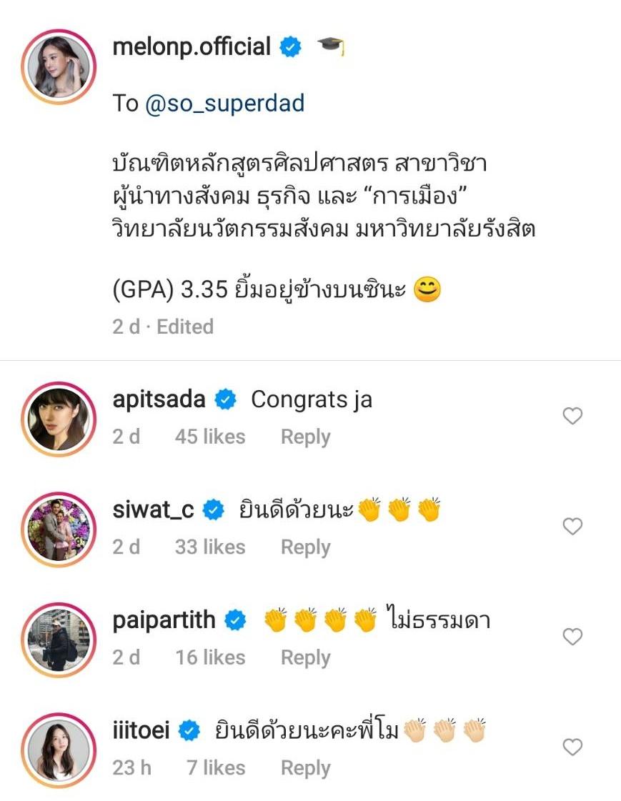ซึ่งแตงโม นิดา โพสต์ภาพตัวเองสวมชุดครุยลงในไอจีส่วนตัว พร้อมทั้งเขียนข้อความและแท็กไอจีคุณพ่อ โดยบอกว่า “To @so_superdad บัณฑิตหลักสูตรศิลปศาสตร สาขาวิชา ผู้นำทางสังคม ธุรกิจ และ “การเมือง” วิทยาลัยนวัตกรรมสังคม มหาวิทยาลัยรังสิต (GPA) 3.35 ยิ้มอยู่ข้างบนซินะ” พร้อมทั้งใส่อีโมจิยิ้มมีความสุข