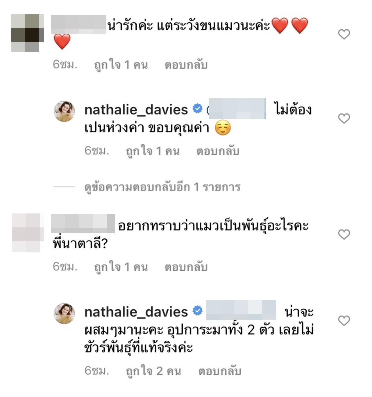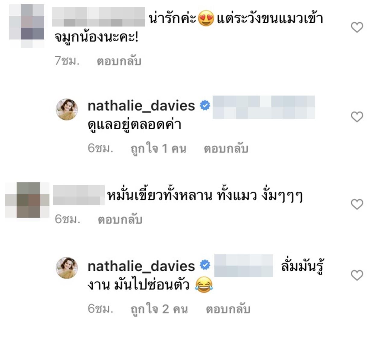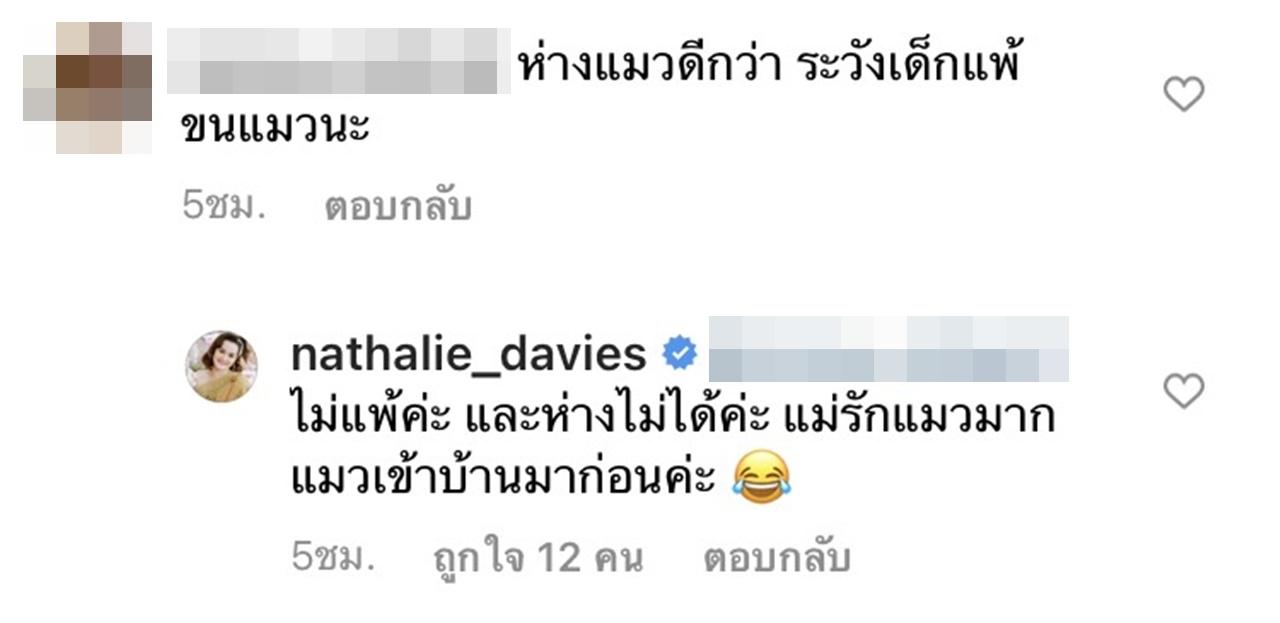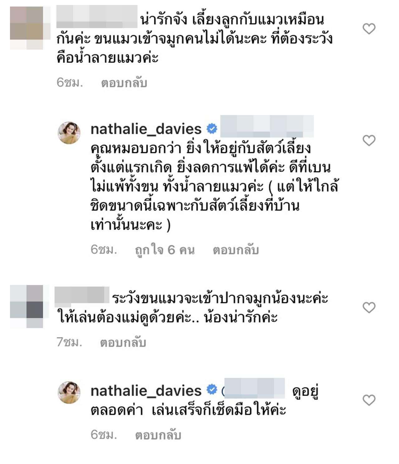 ซึ่งแฟนๆ ที่ติดตามต่างก็เข้ามาชื่นชมในความน่ารักของหนุ่มน้อย น้องเบนกับแมวของคุณแม่นาตาลี และบางส่วนก็เป็นห่วงว่า น้องเบนจะแพ้ขนแมว พร้อมแนะนำไม่อยากให้คุณแม่นาตาลีเลี้ยงน้องกับแมวด้วยกัน แต่ นาตาลี ก็ได้ชี้แจงว่า ดูแลใกล้ชิดอยู่ตลอด และบอกต่อว่า "คุณหมอบอกว่า ยิ่งให้อยู่กับสัตว์เลี้ยงตั้งแต่แรกเกิด ยิ่งลดการแพ้ได้ค่ะ ดีที่เบนไม่แพ้ทั้งขน ทั้งน้ำลายแมวค่ะ (แต่ให้ใกล้ชิดขนาดนี้เฉพาะกับสัตว์เลี้ยงที่บ้านเท่านั้นนะคะ)".