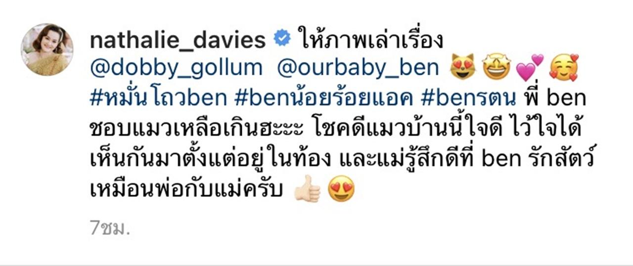 ล่าสุด นาตาลี ก็ได้โพสต์ภาพลูกชายถ่ายคู่กับน้องแมว พร้อมเขียนแคปชั่นว่า "ให้ภาพเล่าเรื่อง @dobby_gollum @ourbaby_ben #หมั่นโถวben #benน้อยร้อยแอค #benรตน พี่ ben ชอบแมวเหลือเกินฮะะะ โชคดีแมวบ้านนี้ใจดี ไว้ใจได้ เห็นกันมาตั้งแต่อยู่ในท้อง และแม่รู้สึกดีที่ ben รักสัตว์เหมือนพ่อกับแม่ครับ"