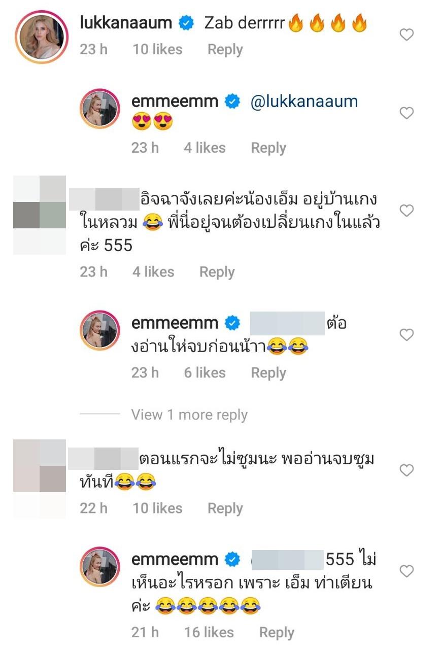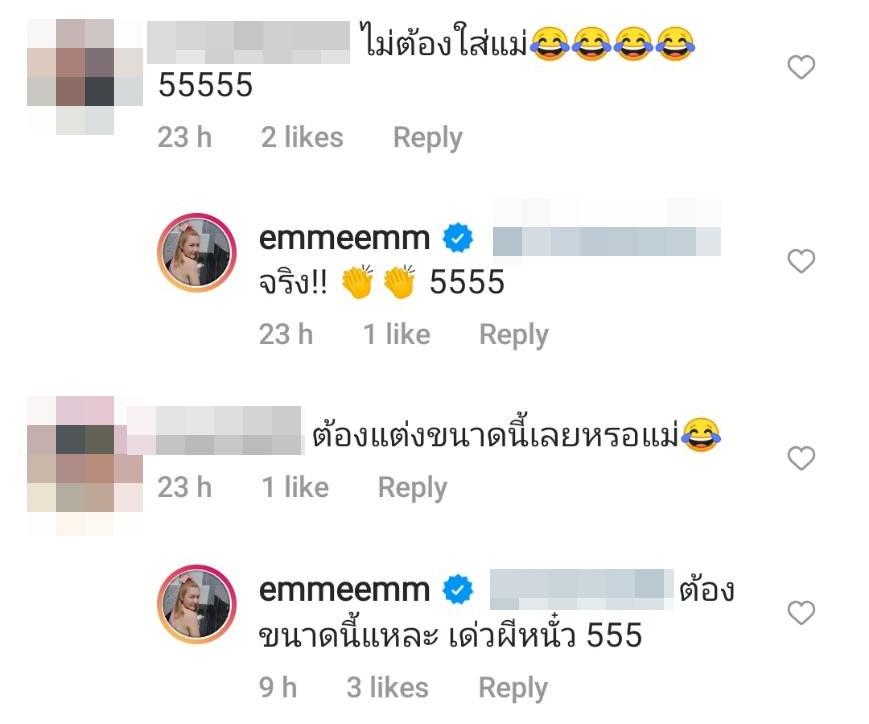 งานนี้เลยมีแฟนๆ รวมถึงเพื่อนๆ แห่คอมเมนต์แซวหลายข้อความเลยทีเดียว บ้างก็แซวว่าตอนแรกจะไม่ซูมนะ พออ่านจบซูมทันที ก่อนที่เอ็มจะตอบกลับว่า “555 ไม่เห็นอะไรหรอก เพราะ เอ็ม ท่าเตียน ค่ะ” และมีบางคนแซวว่าต้องแต่งขนาดนี้เลยเหรอแม่ งานนี้เอ็มตอบชัดเจน “ต้องขนาดนี้แหละ เด่วผีหนั๋ว 555”