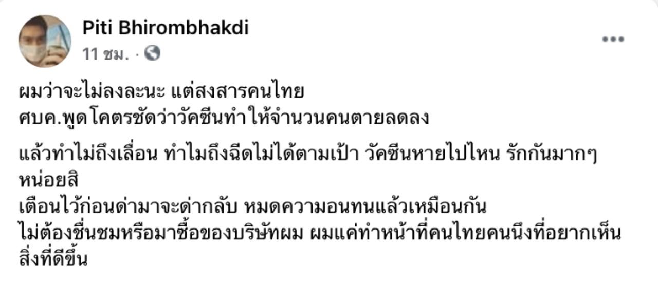 “ผมว่าจะไม่ลงละนะ แต่สงสารคนไทย ศบค.พูดโคตรชัดว่าวัคซีนทำให้จำนวนคนตายลดลง แล้วทำไมถึงเลื่อน ทำไมถึงฉีดไม่ได้ตามเป้า วัคซีนหายไปไหน รักกันมากๆ หน่อยสิ เตือนไว้ก่อนด่ามาจะด่ากลับ หมดความอดทนแล้วเหมือนกัน ไม่ต้องชื่นชมหรือมาซื้อของบริษัทผม ผมแค่ทำหน้าที่คนไทยคนนึง ที่อยากเห็นสิ่งที่ดีขึ้น