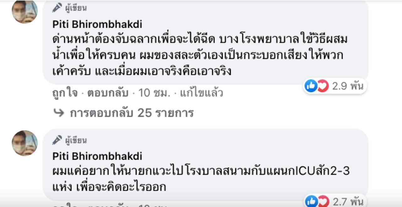- ด่านหน้าต้องจับฉลาก เพื่อจะได้ฉีด บางโรงพยาบาลใช้วิธีผสมน้ำ เพื่อให้ครบคน ผมขอสละตัวเองเป็นกระบอกเสียงให้พวกเค้าครับ และเมื่อผมเอาจริง คือเอาจริง