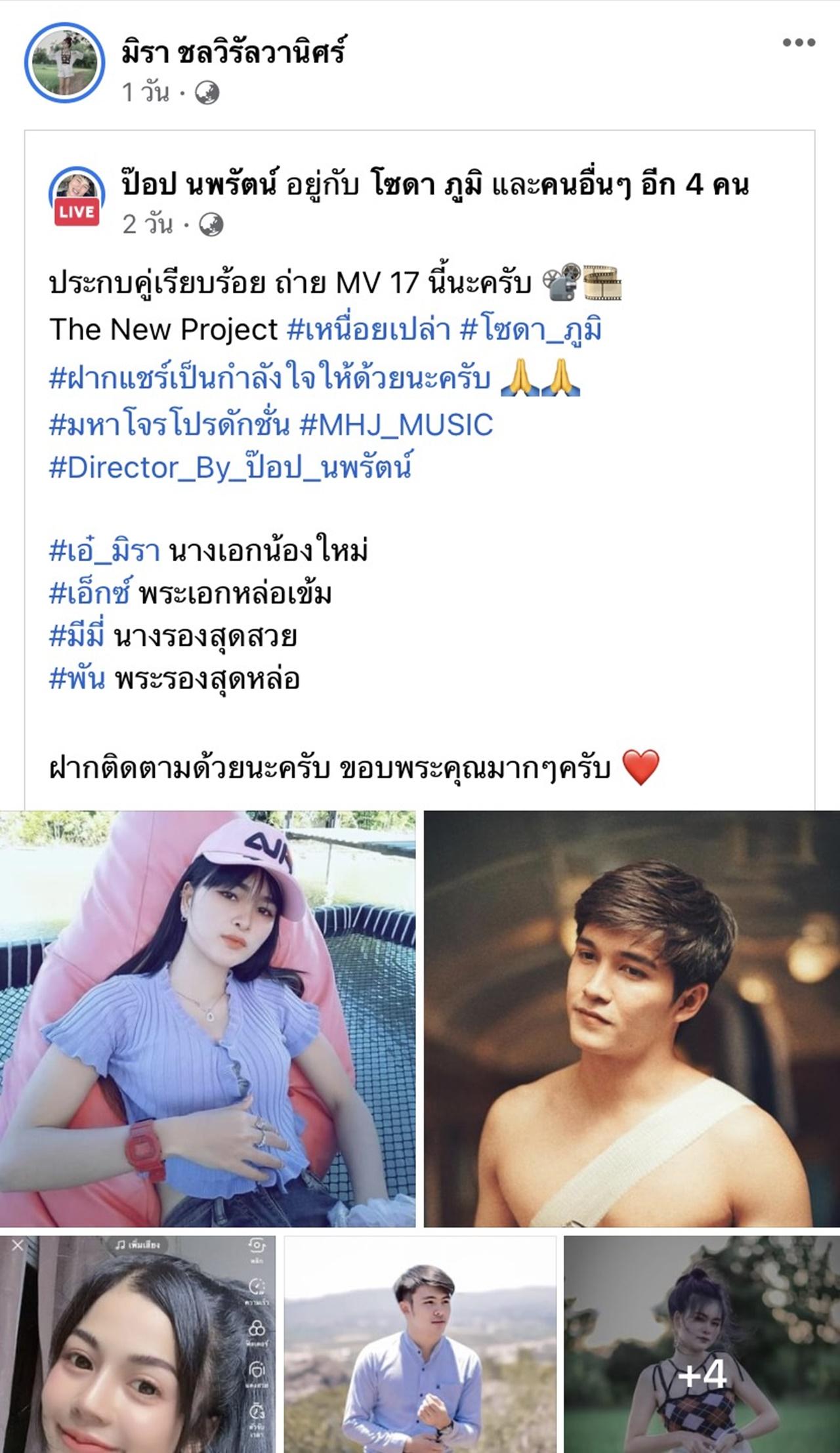 ล่าสุด เอ๋ มิรา เพิ่งจะได้ประกบคู่พระเอกหล่อเข้ม เตรียมขึ้นแท่นนักร้อง-นางเอกน้องใหม่ โดยสาวเอ๋ได้แชร์เฟซบุ๊กของผู้ใช้ที่ชื่อว่า ป๊อป นพรัตน์ ที่ได้โพสต์ข้อความและภาพเอ๋กับเหล่านักแสดงมิวสิกวิดีโอว่า