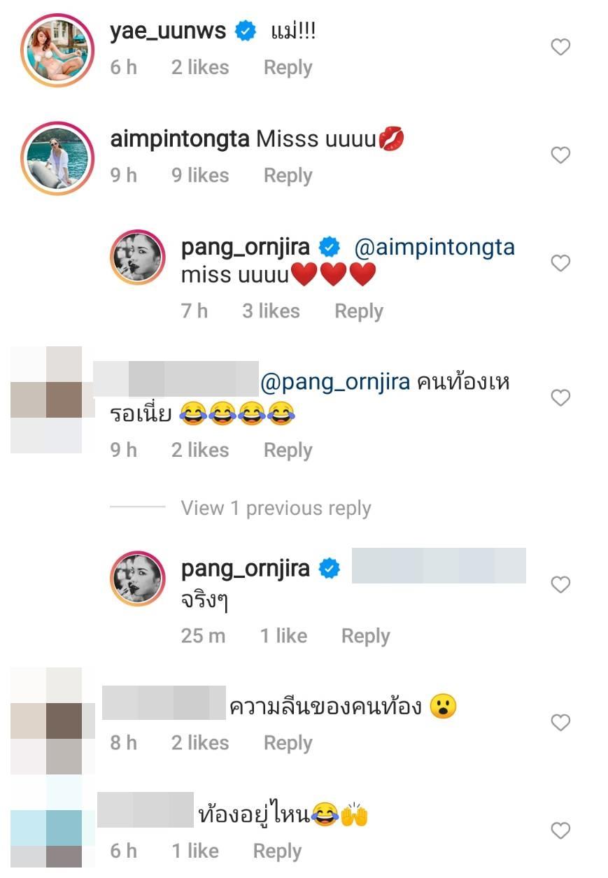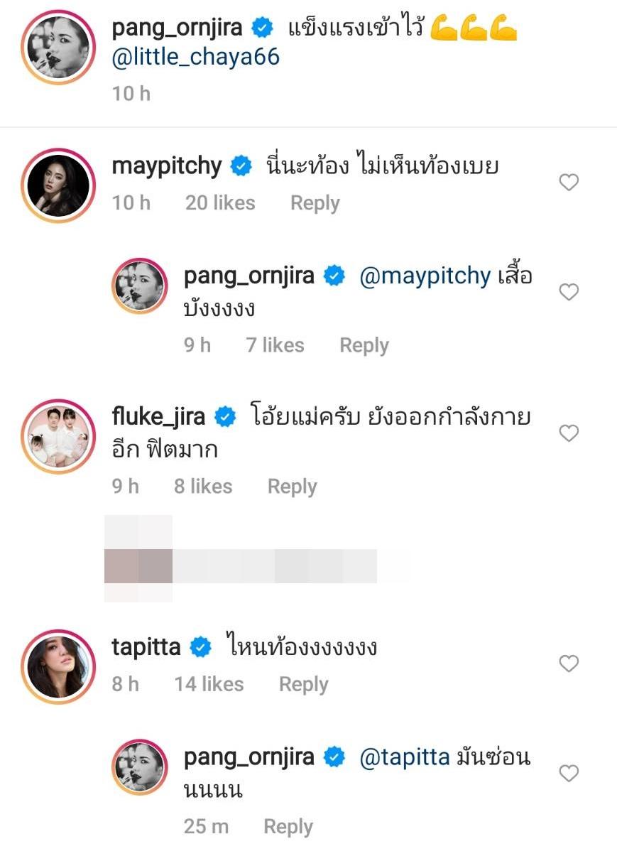 ทำเอาเพื่อนๆ ในวงการบันเทิงแห่คอมเมนต์ถึงว่าที่คุณแม่กันยกใหญ่ อาทิ เมย์ พิชญ์นาฏ “นี่นะท้อง ไม่เห็นท้องเบย”, ฟลุค จิระ “โอ๊ย แม่ครับ ยังออกกำลังกายอีก ฟิตมาก”, พิตต้า ณ พัทลุง “ไหนท้องงงงงงง”, หญิงแย้ นนทพร “แม่!!!” ฯลฯ