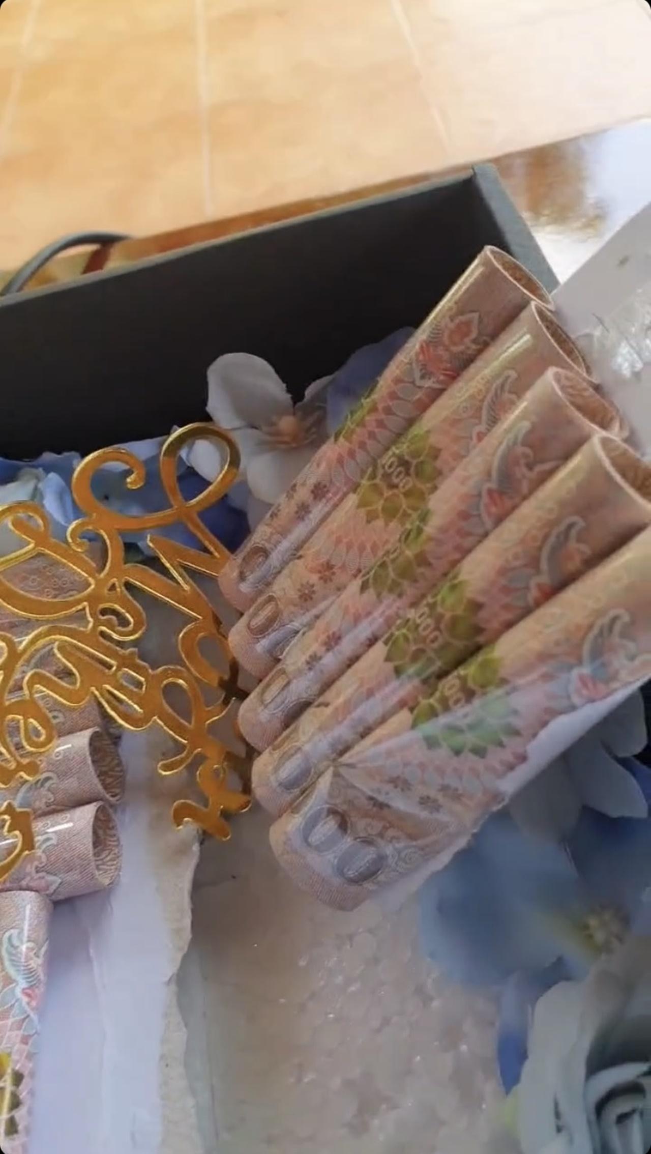 จากนั้น ภรรยาของเท่ง เถิดเทิง ก็ได้ถามความรู้สึกของสามีหลังจากที่ได้เห็นของขวัญจากลูกชายเป็นเงินสดจำนวน 2 แสนบาท ซึ่งเท่งพูดไปยิ้มไปว่า